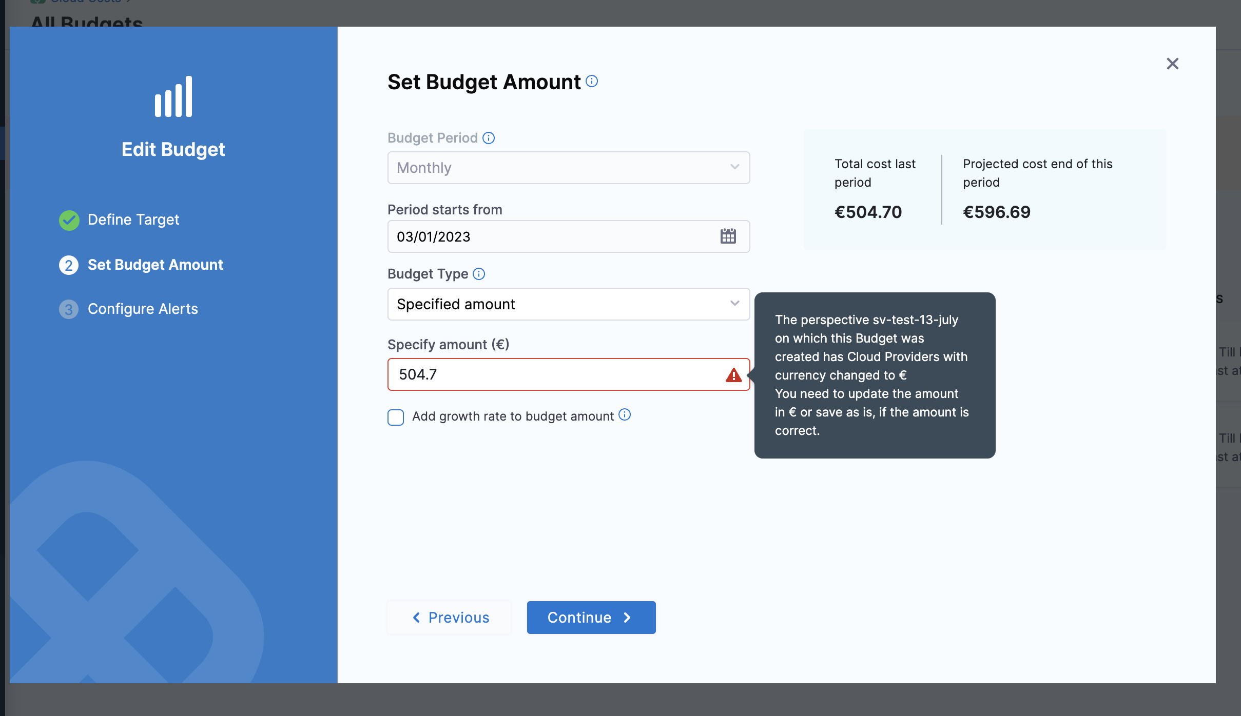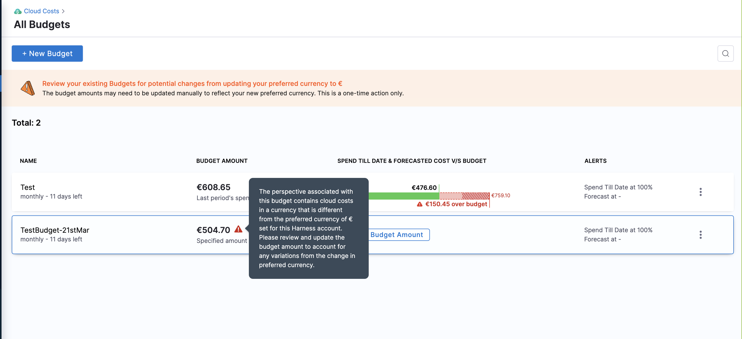 • For existing budgets and new budgets, you must manually update the Specify Amount field with the converted value in the selected currency. This is because a Perspective may be associated with multiple cloud accounts and therefore cannot be updated automatically.