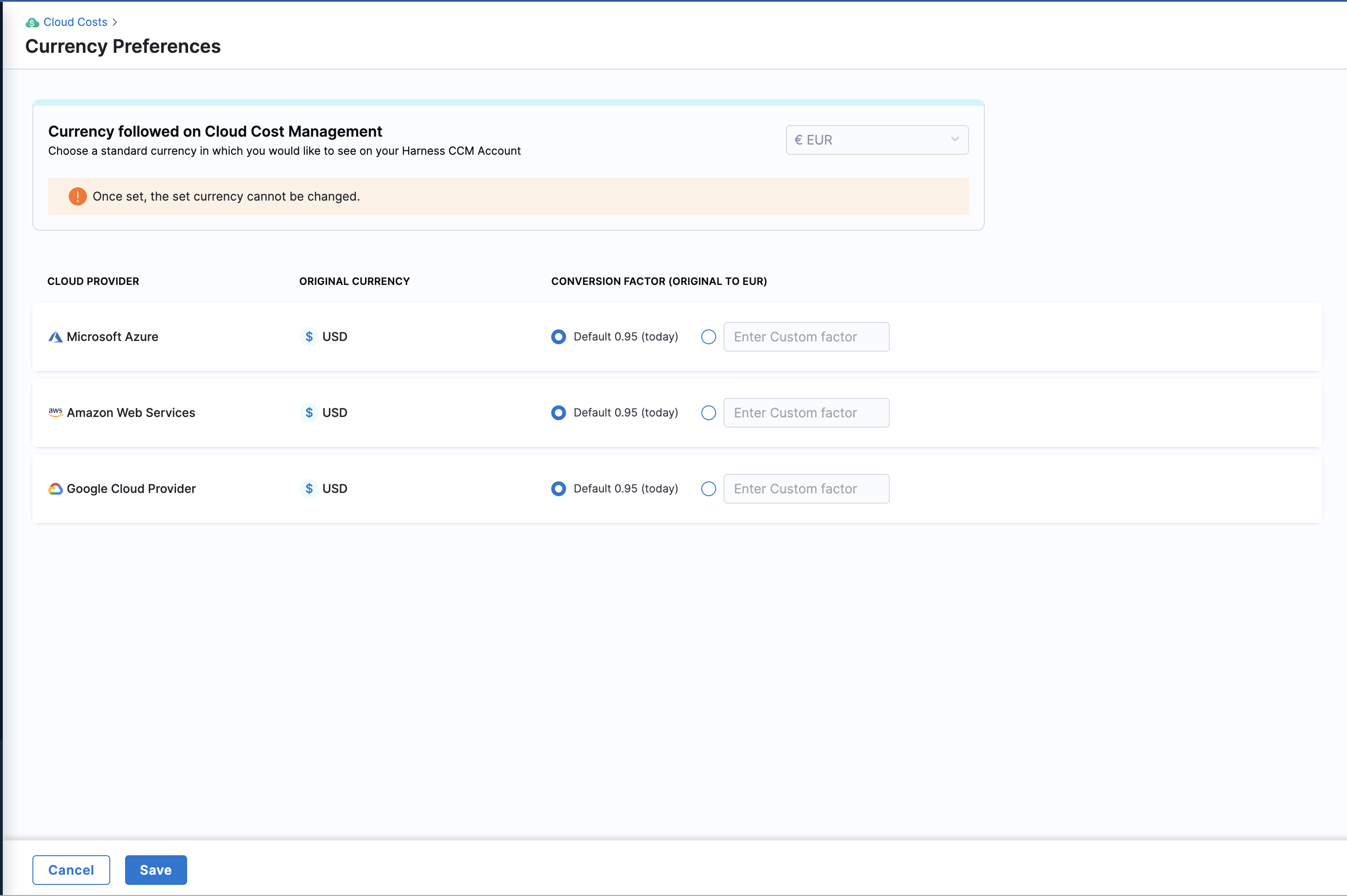 If you have selected Default, the conversion factor is taken from the CUR or the Billing Export reports. If the conversion factor is not available in these reports, a publicly available conversion factor for the selected currency is used. It's important to note that the conversion factor may vary slightly between different cloud accounts.