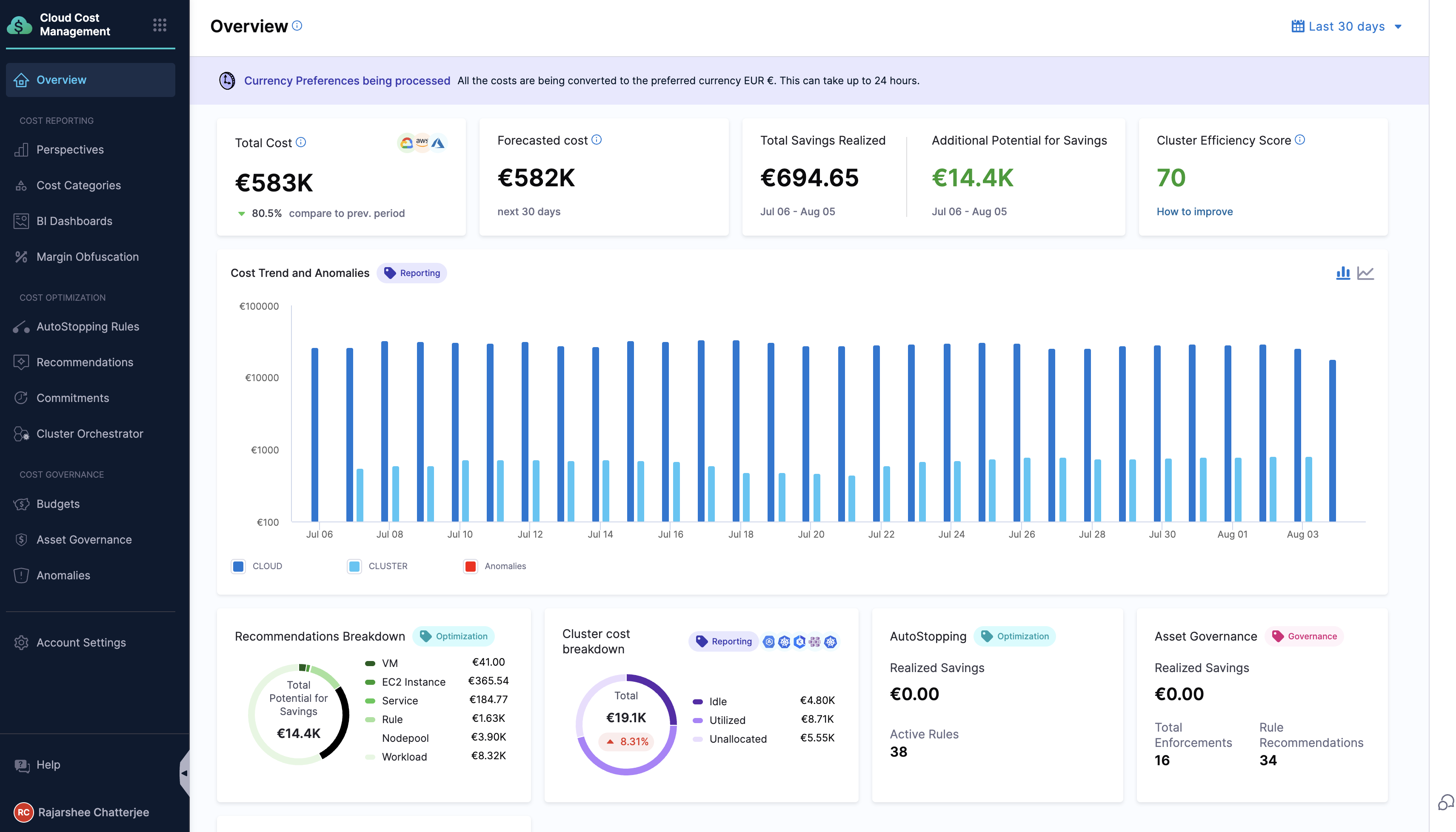 • After configuring the currency settings, the currency symbol immediately changes to the preferred one. However, the cost data does not change and remains in the original currency. It may take up to 24 hours for the converted value to be displayed.