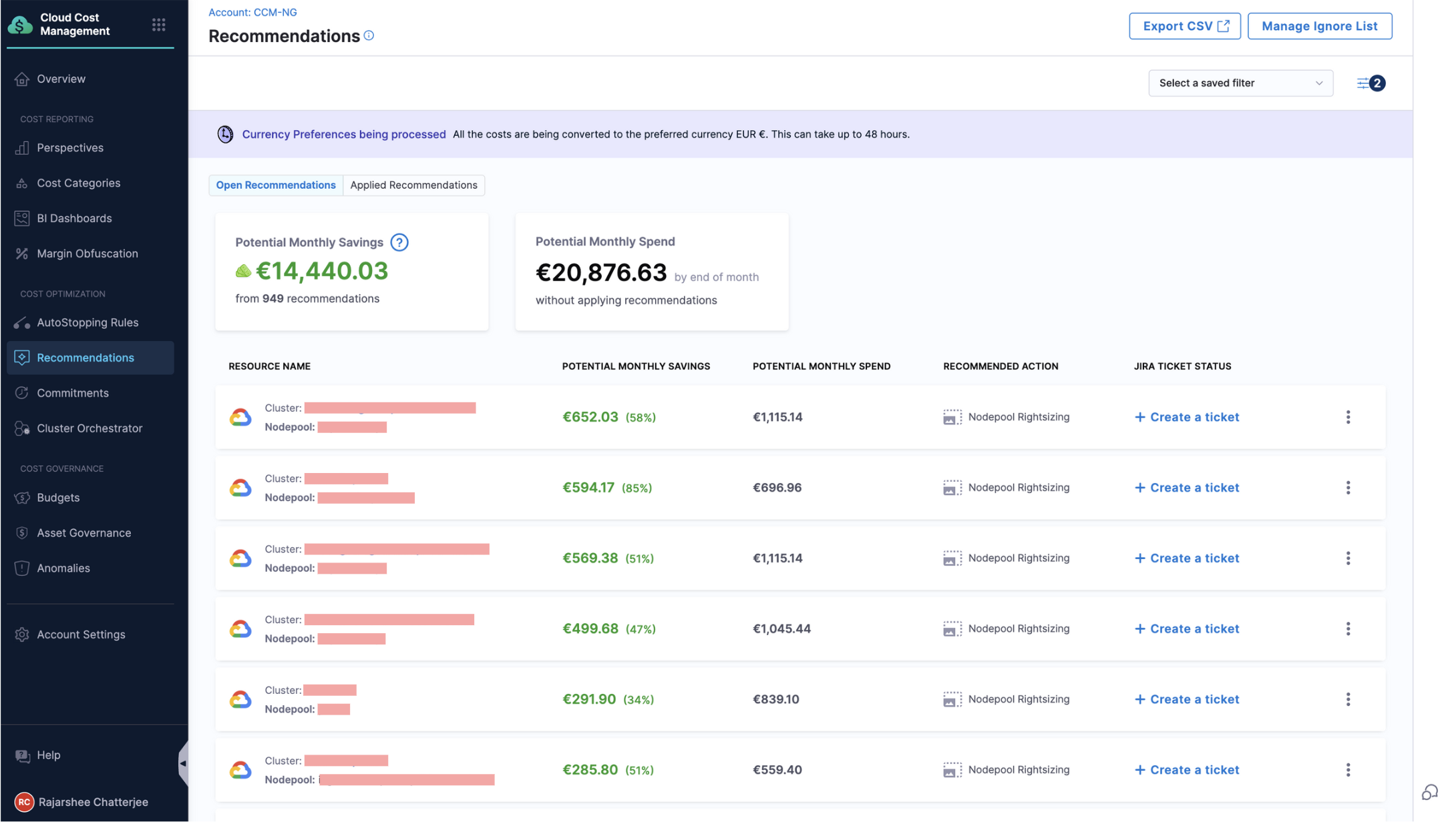 • Currency standardization is supported only within CCM. Note that the currency symbol in Dashboards is not changed, but the cost is displayed in the preferred currency.