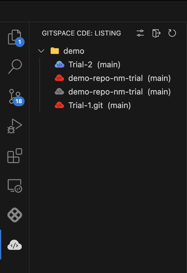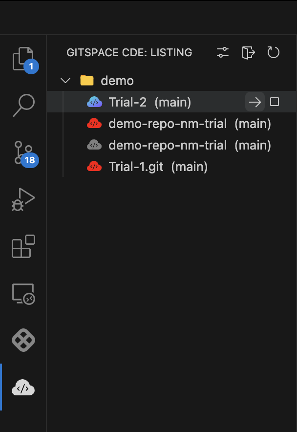1. Click the Gitspaces icon in the activity bar to view all your Gitspaces in the sidebar. Select any Gitspace to open and start working on it.
