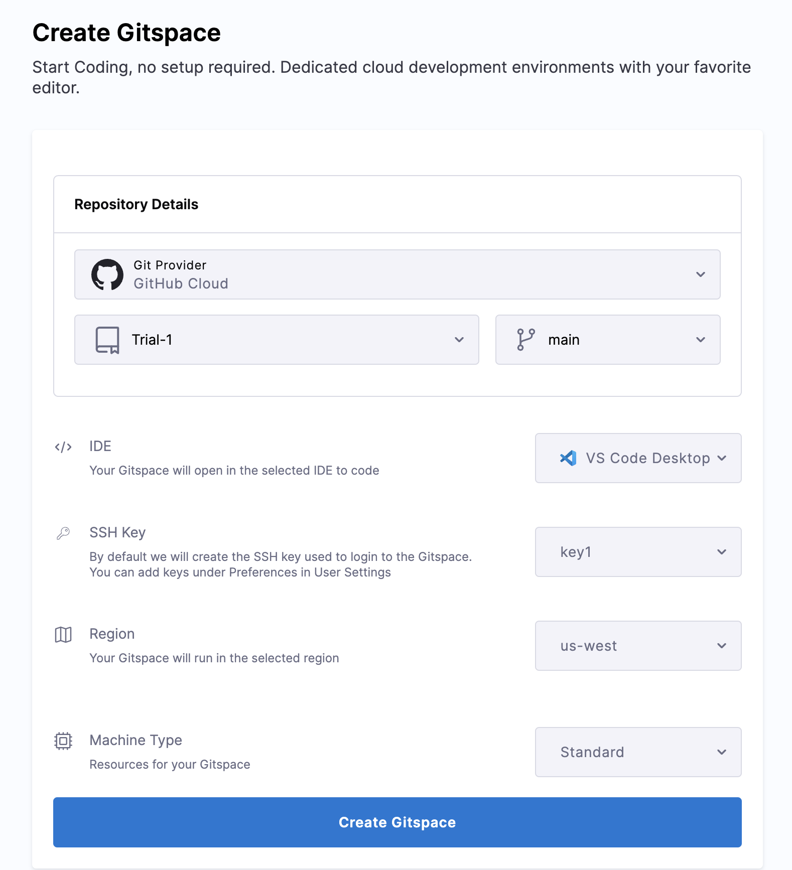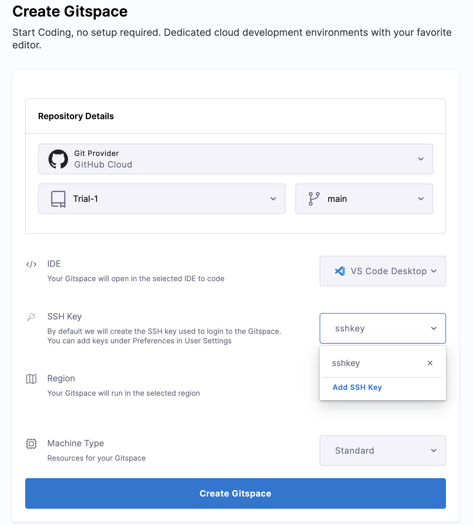 To connect to a Gitspace with VS Code Desktop, you can use an SSH key. You can create a new SSH key using ssh-keygen (learn more here on how to create an SSH key). This generates a pair of keys (public and private). Copy the public key and paste it into the "SSH key" field while setting up a Gitspace (as shown in the picture below). This will enable you to establish a remote connection to the Gitspace via SSH. If you prefer not to use an SSH key, you can use the temporary password method outlined below.