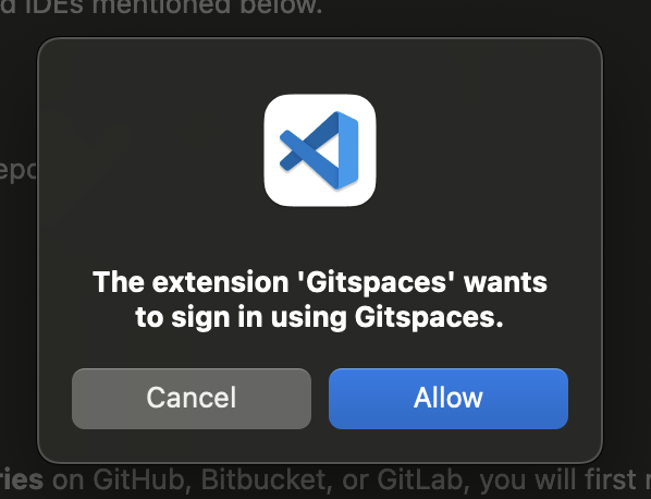 1. A dialog will appear asking to open your browser for Gitspaces authentication. Click “Allow” and “Open” to proceed.
