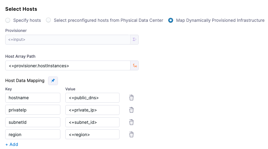 • Map Dynamically Provisioned Infrastructure: Map outputs from a provisioner (Terraform, CloudFormation, etc.) to resolve hosts at runtime. For details, see Dynamically provisioned infrastructure.