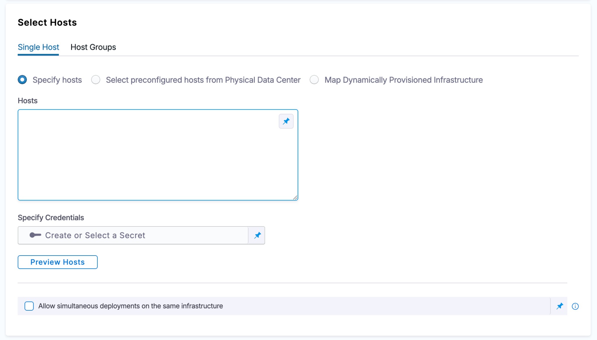 The Physical Data Center (PDC) infrastructure type targets Windows servers that are not managed through Azure or AWS connectors. When you select PDC as the infrastructure type, Harness presents two host configuration modes: Single Host and Host Groups.