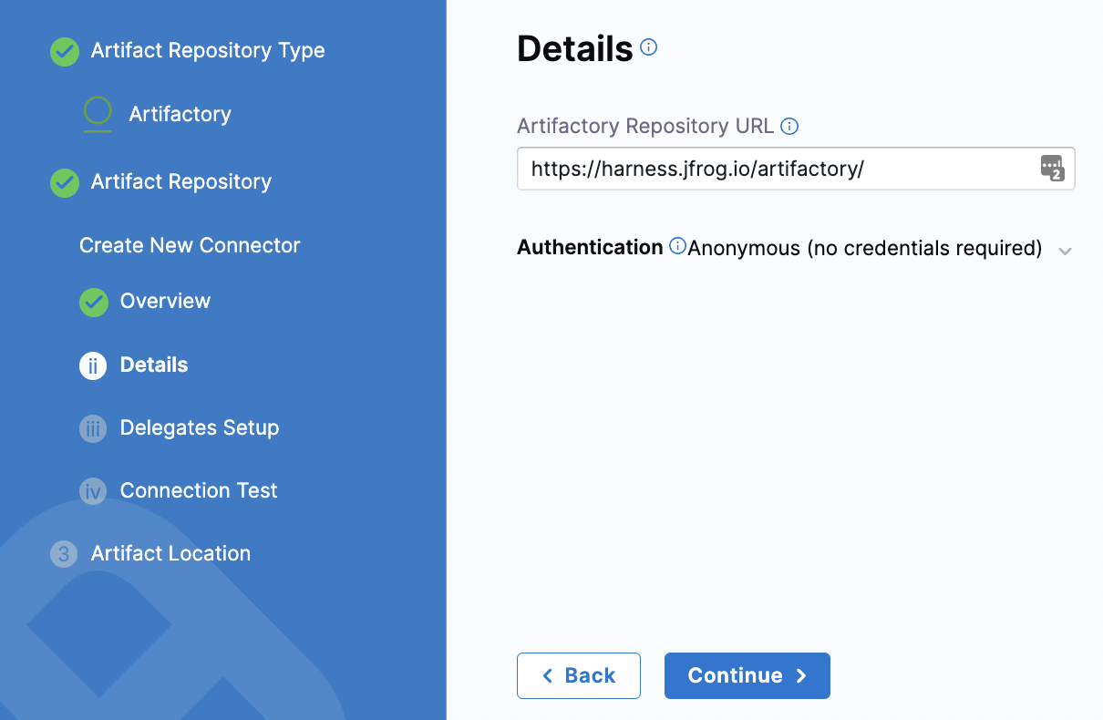 1. Click Continue to connect with Artifactory by using a Harness Delegate.