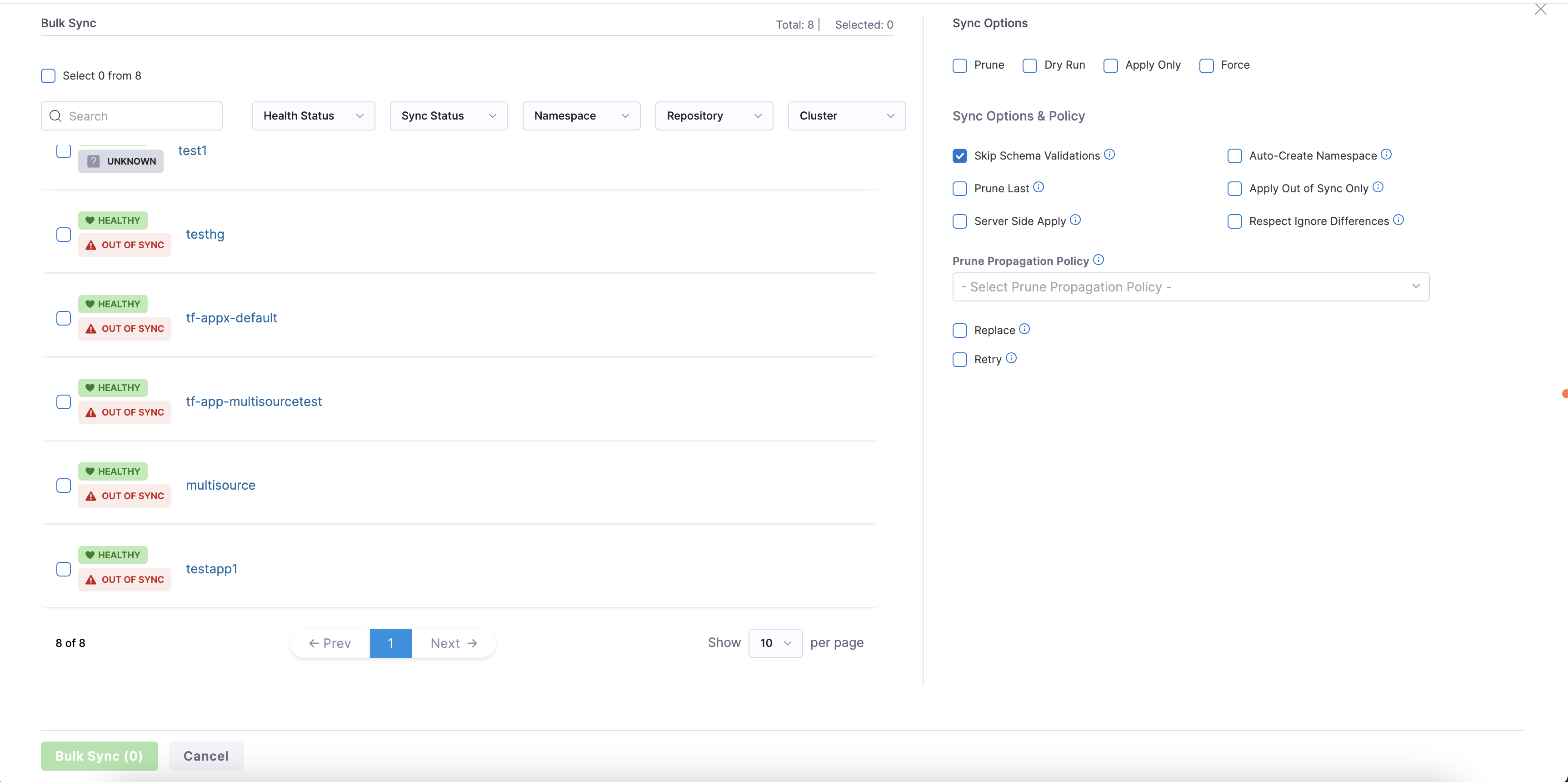 Click the Bulk Sync button in the top left to sync many applications at once or click Refresh in the top right. The following screen will appear for bulk sync, and a very similar screen will appear for refresh: