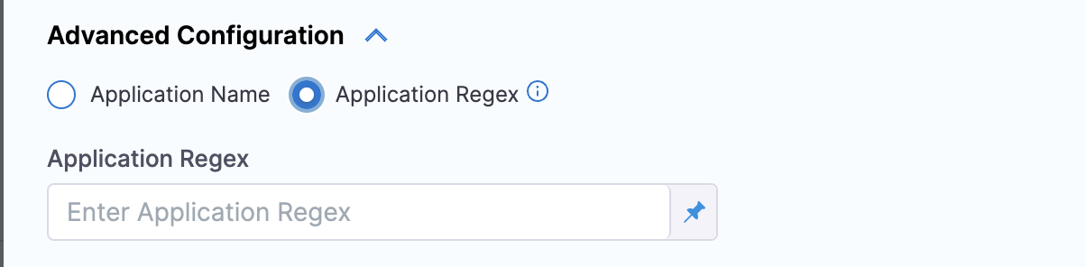 6. In Advanced Configuration, select the application you want to sync and configure the sync options. You can either choose an application or applications manually, or you can match up to 1000 applications using a regex filter. The regex field uses Go (Golang) regex syntax — not JEXL. You can test your patterns at regex101 with the Golang flavor selected.