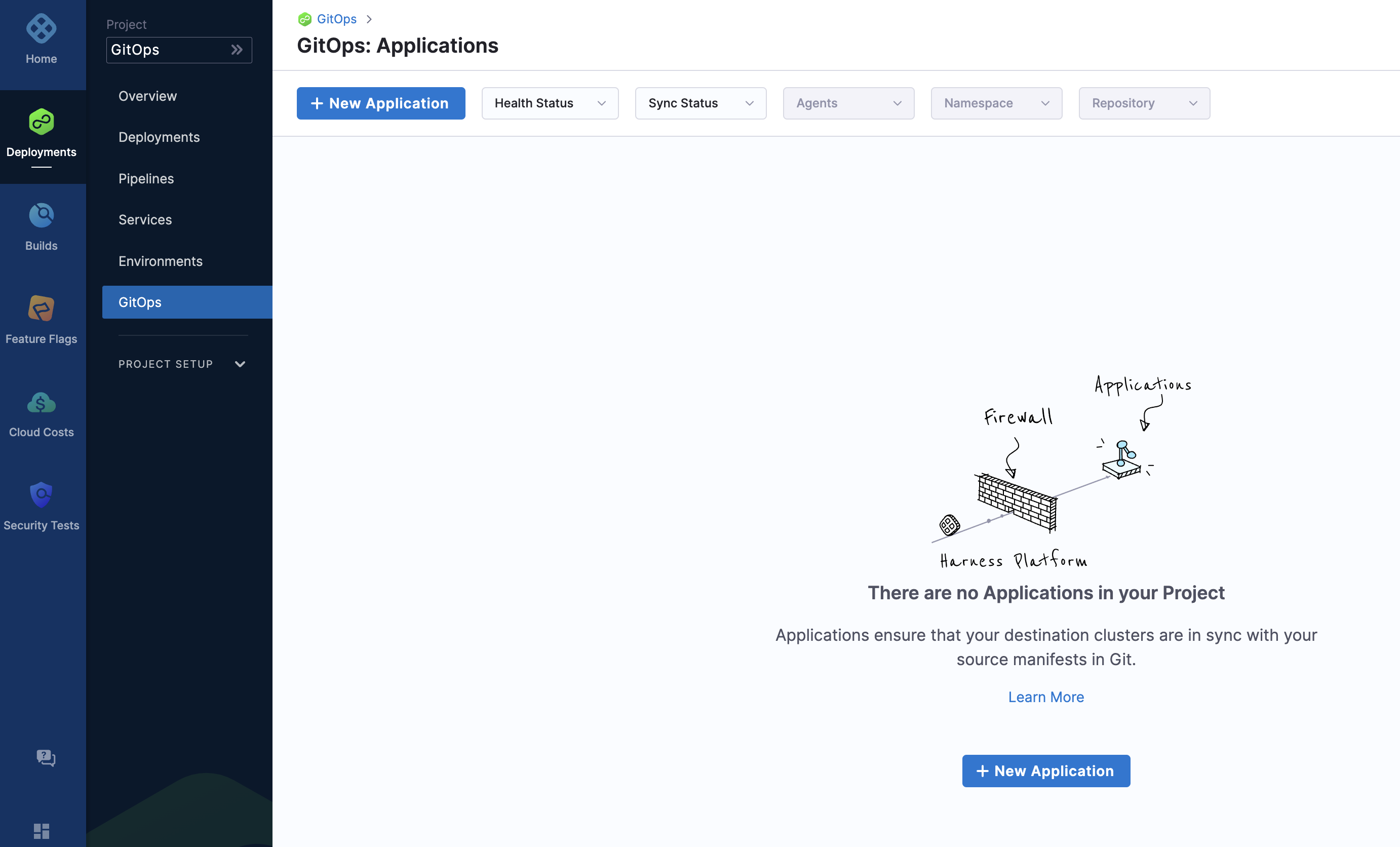 The Harness GitOps Overview, Applications, and Settings appear. If this is the first time GitOps has been set up in the Project, the Applications will be empty.