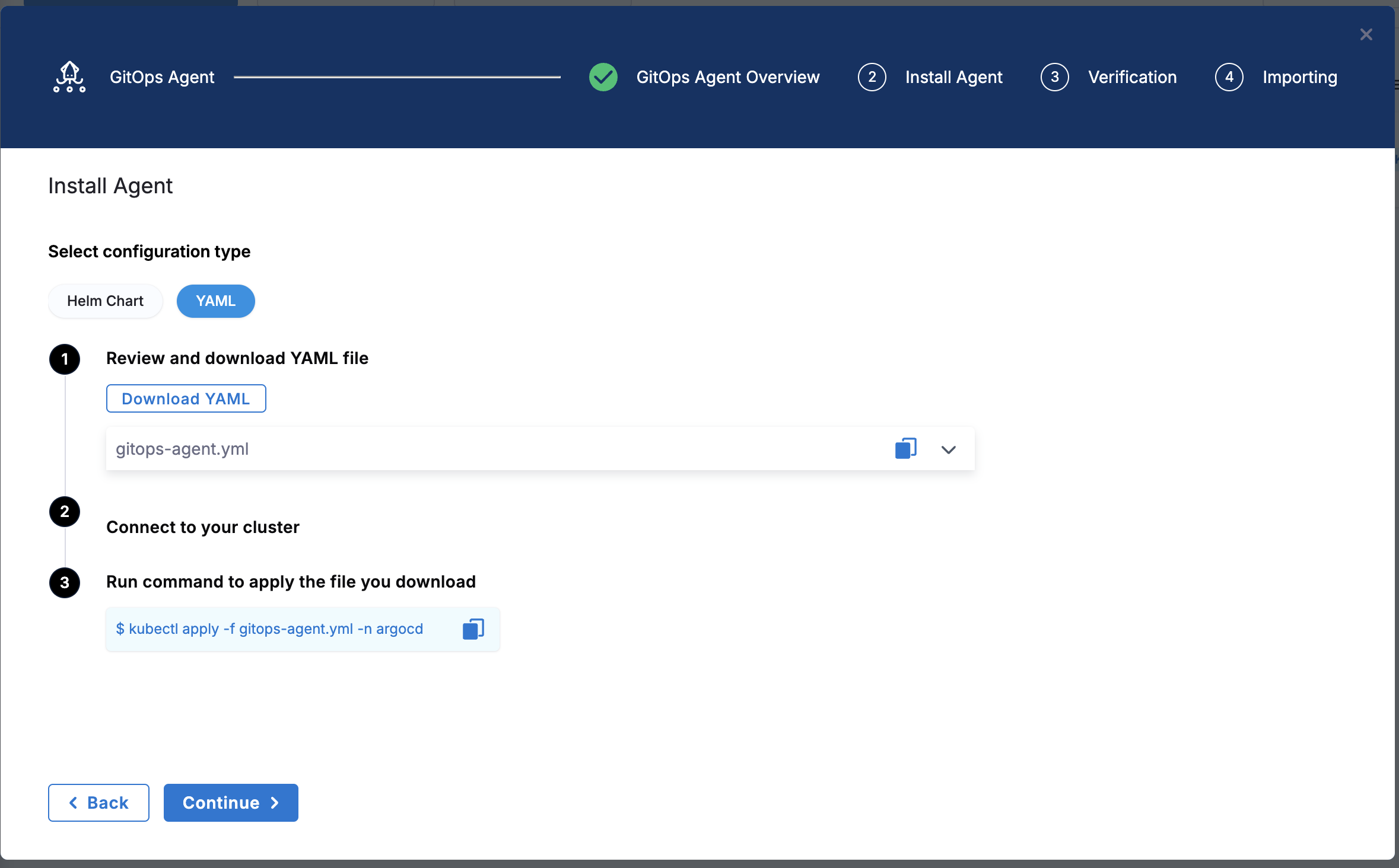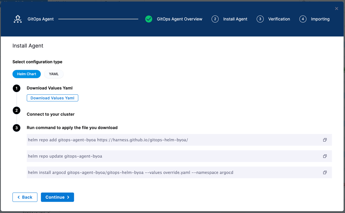 The Helm Chart option lets you download a override.yaml file for the Harness GitOps Agent. Download this file and pass it as values to the Helm chart.