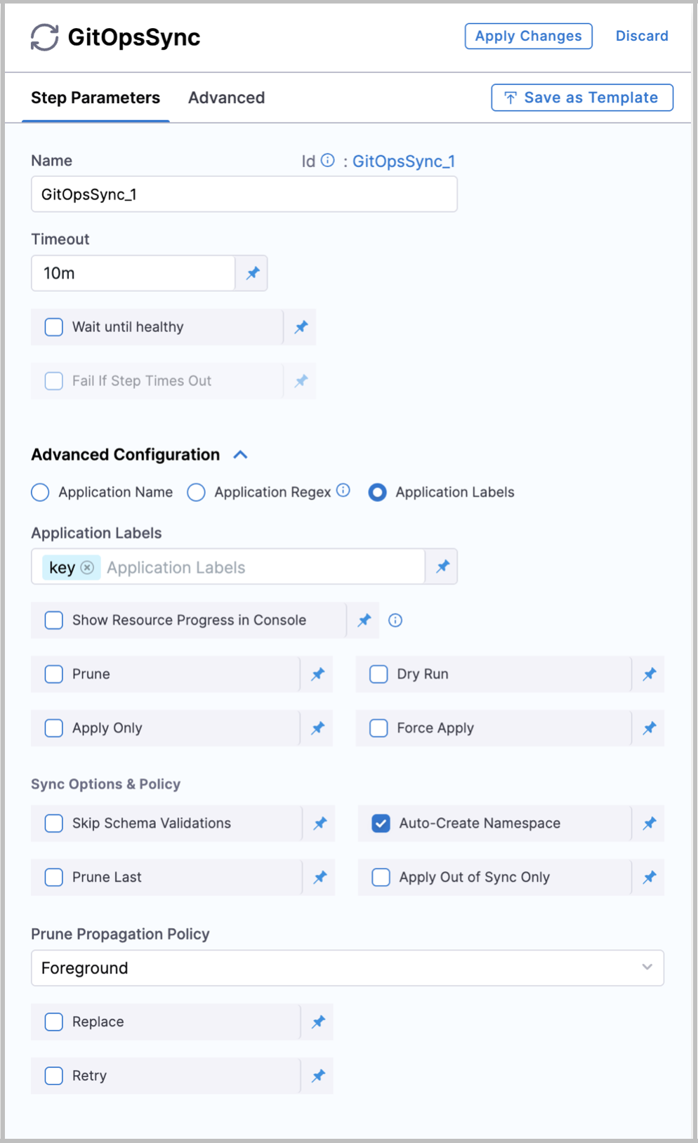 - Wait until healthy: Enable this checkbox to hold the step until the application reaches a