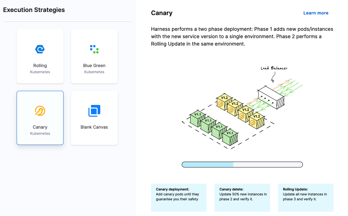 Harness supports all deployment strategies, such as blue/green, rolling, and canary.