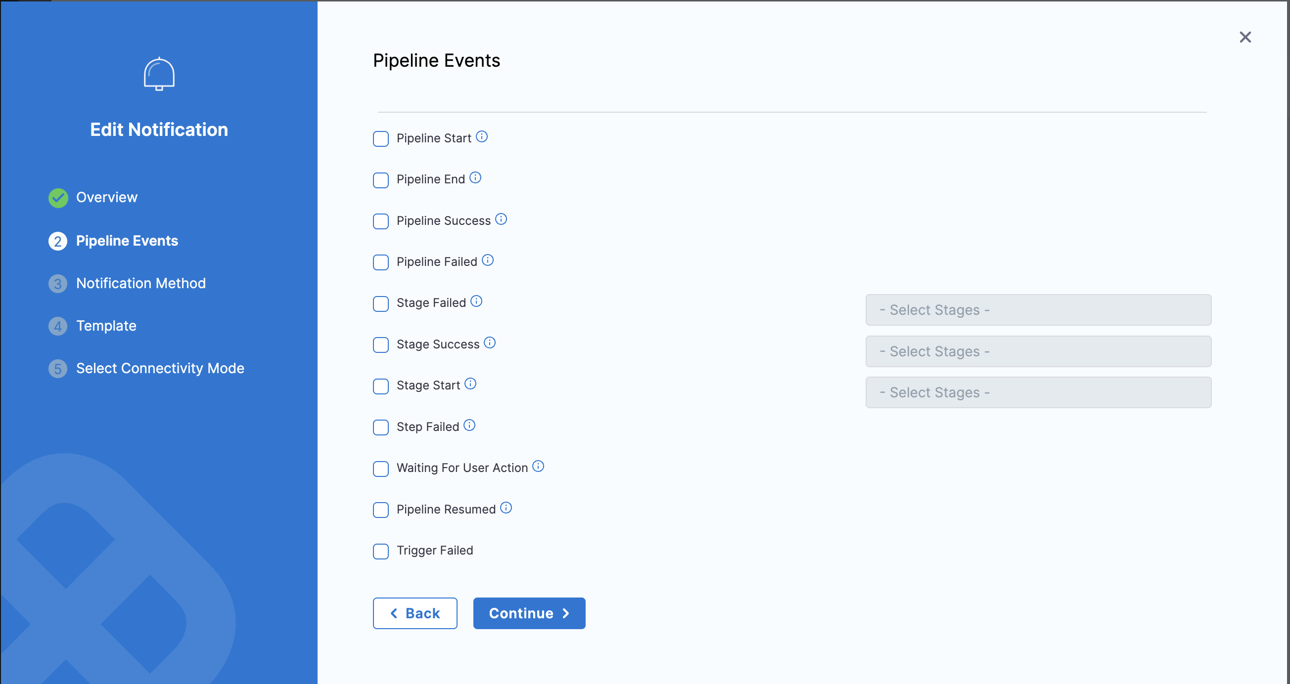 - Waiting for User Action fires whenever the pipeline enters a waiting state because it needs user input. This includes Approval steps, Manual Intervention steps, and runtime execution inputs. The notification is sent at the pipeline level and cannot be scoped to a specific step type or stage. This event is different from Pipeline Pause, which only triggers on a manual pause of the execution.