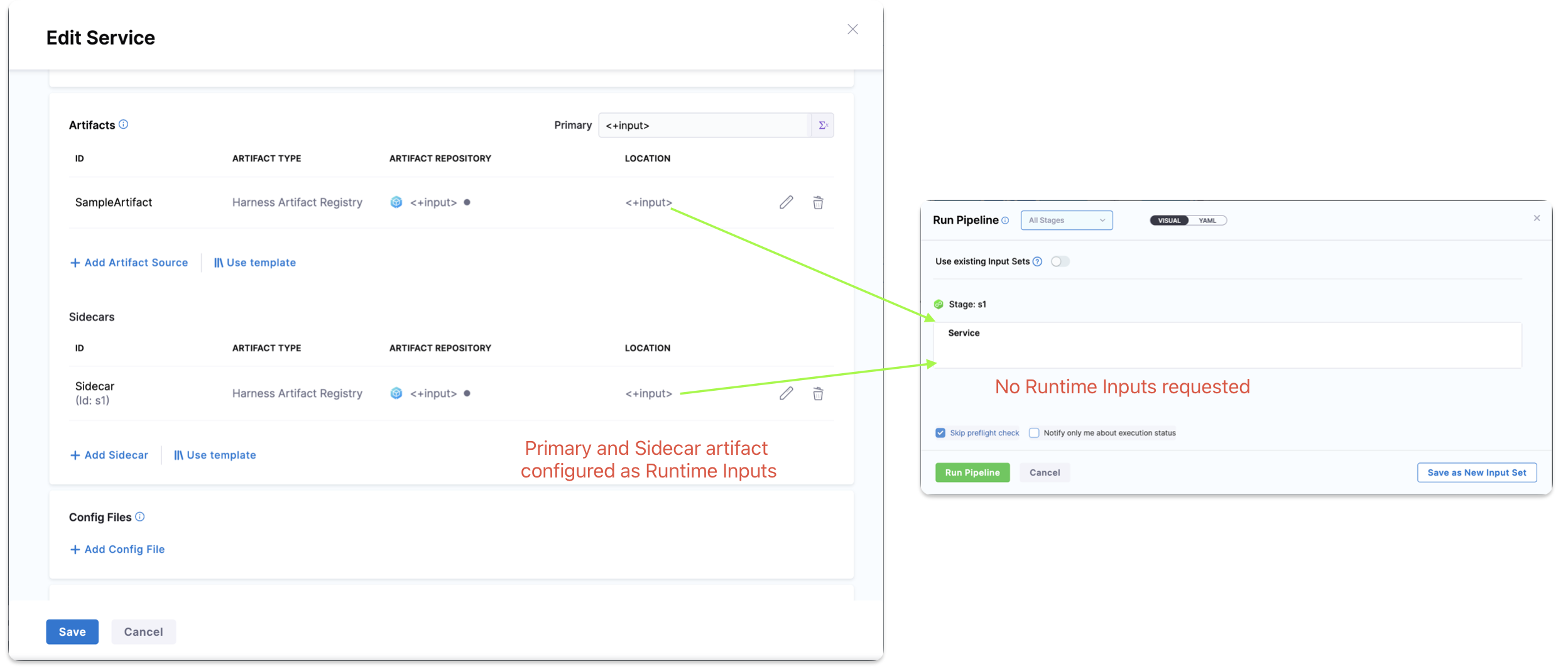 • If the Disable artifact in this stage checkbox is enabled, and the artifact or artifact tag is configured as runtime inputs, the pipeline will not prompt for the artifact or artifact tag during execution.