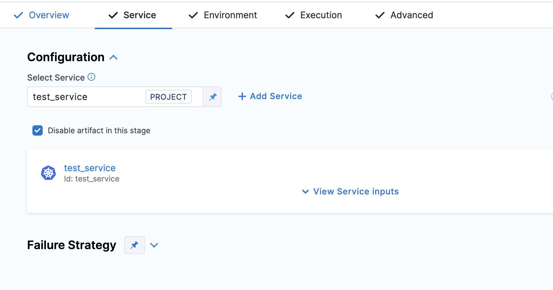 You can bypass artifact consumption checks for a service in a Deploy stage by selecting the Disable artifact in this stage checkbox. When this option is enabled, the pipeline treats the service without artifact configuration, skips the artifact consumption check process.