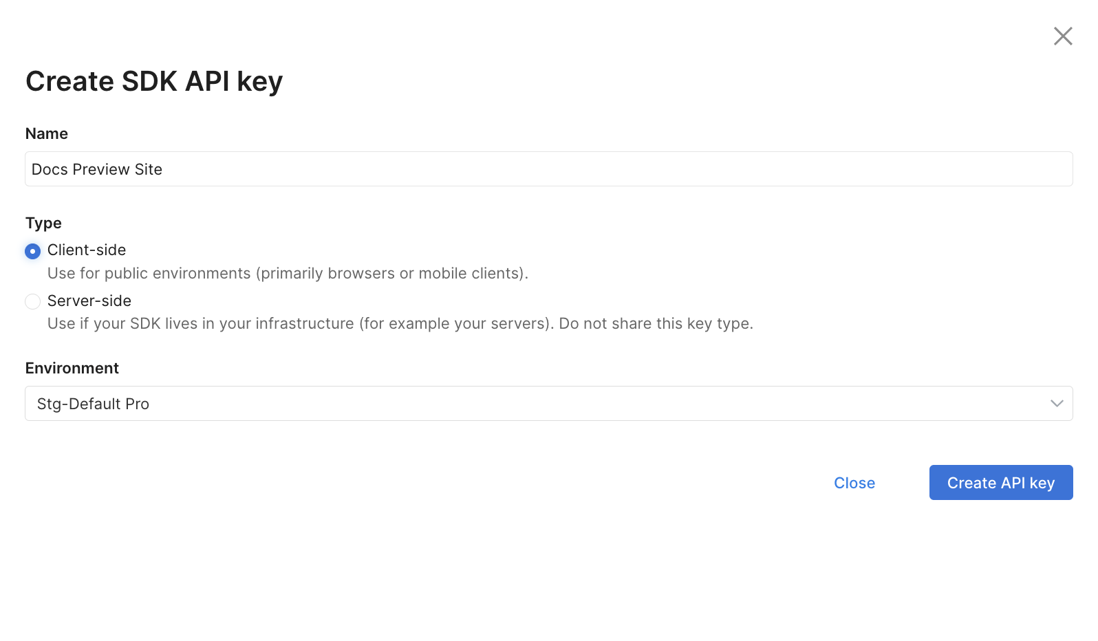 5. Select the type of SDK API key: Client-side or Server-side.