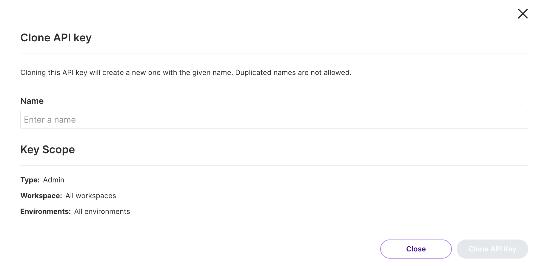 3. From the Admin API keys tab, click Clone on the desired key. The Clone API key view appears.