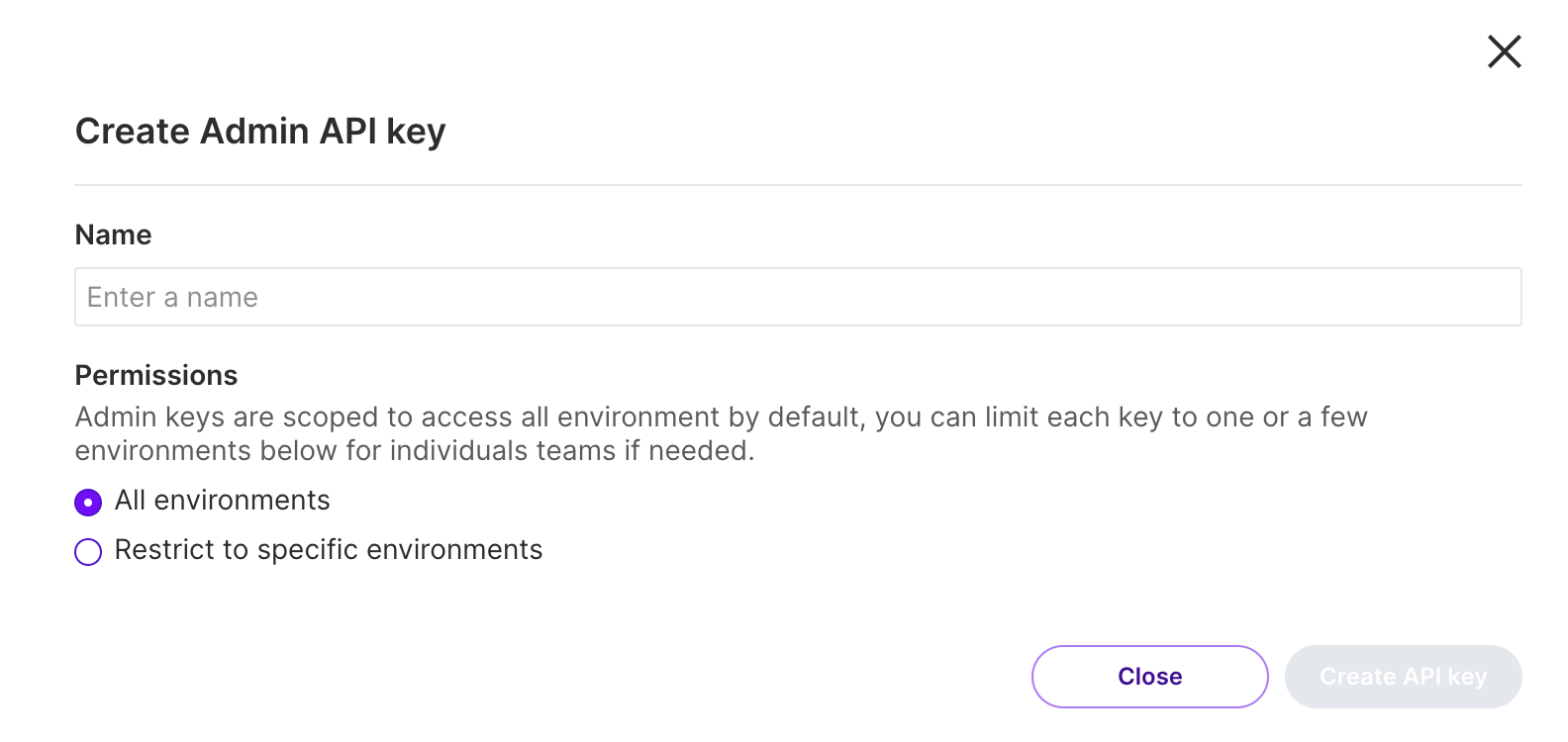 2. Specifying a scope for the API key: This limits the reach of the API key across environments, a project, or the whole account.