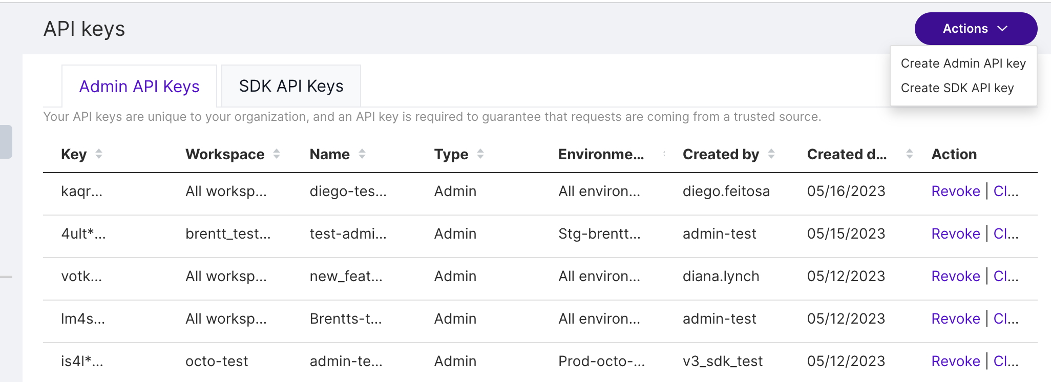 3. From the Admin API keys tab, click Actions and then Create SDK API key . The Create SDK API key view appears.