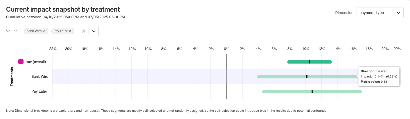 The Impact snapshot chart in the Metric details dashboard supports dimensional analysis for experiments in the same way it does for feature flags.