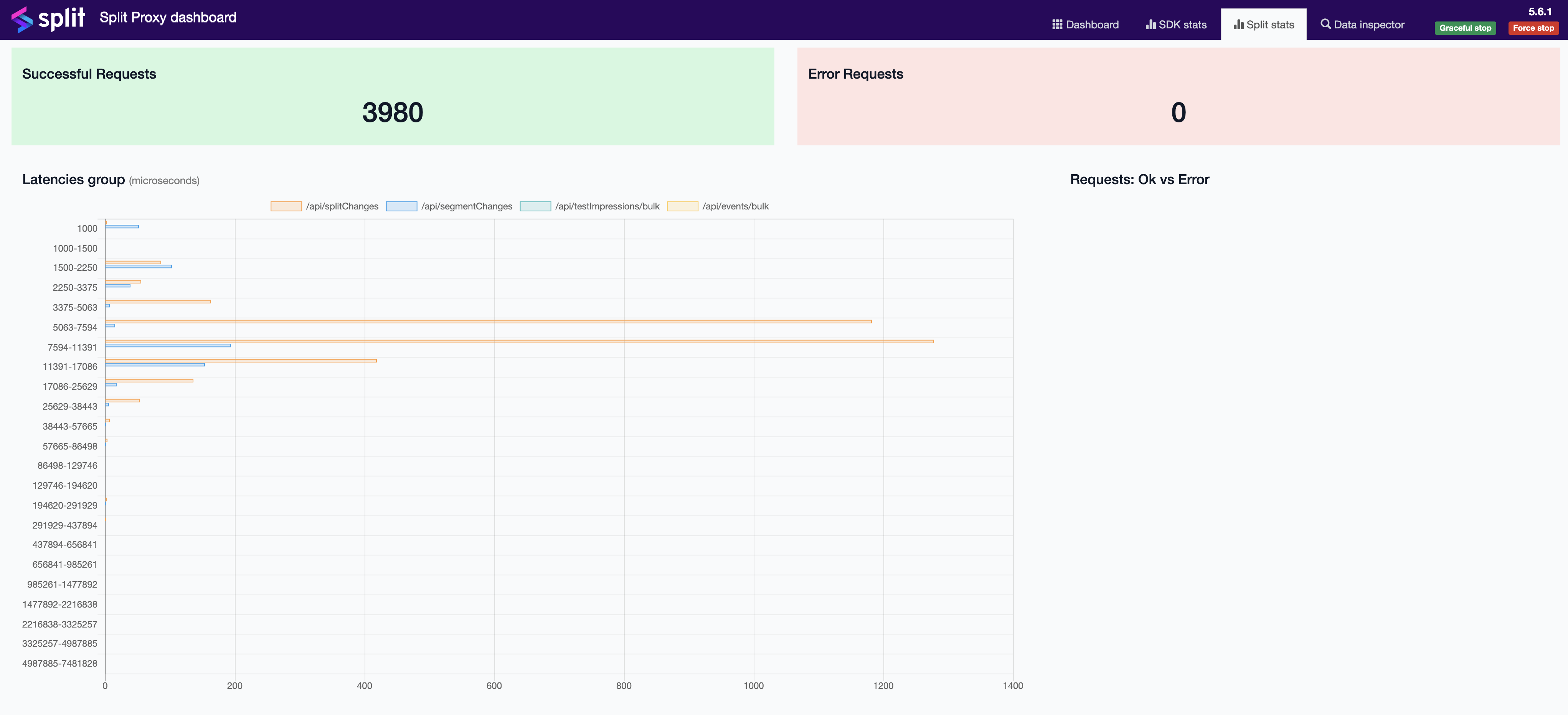 The Split Proxy exposes an observability endpoint that provides insights into both cached data and incoming SDK requests. This includes request volume, latency distribution, and HTTP response status codes, allowing you to monitor how the Proxy is handling traffic in real time.