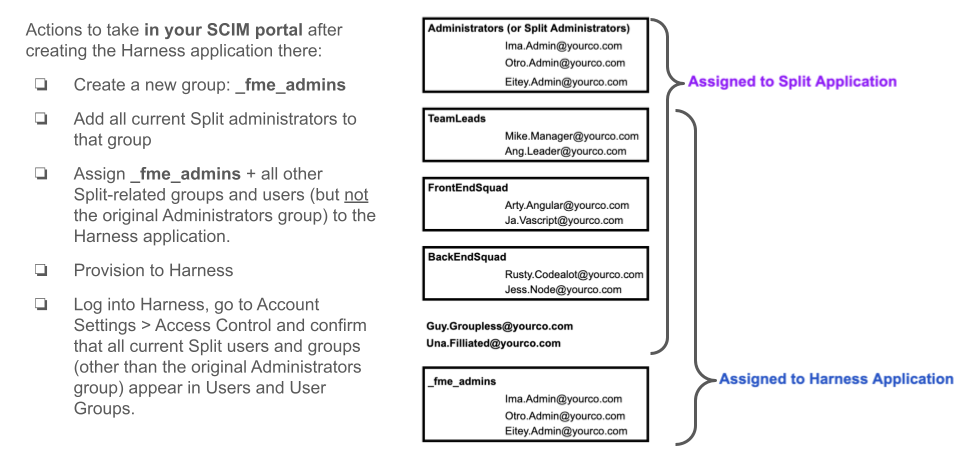 The Split migration process will place all of your current Split Administrators in a Harness User Group called All FME Admins and grant this User Group the appropriate RBAC permissions for you. All you need to do is configure SCIM to maintain that list (instead of Split_Administrators) going forward.