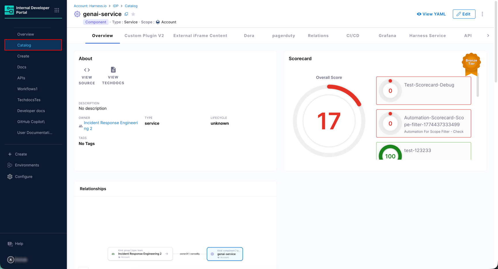 Open any entity to view its Overview, Relationships, Scorecards, and any other tabs configured for your entity layout. The Relationships section reflects ownership links between teams and services as discovered from PagerDuty.