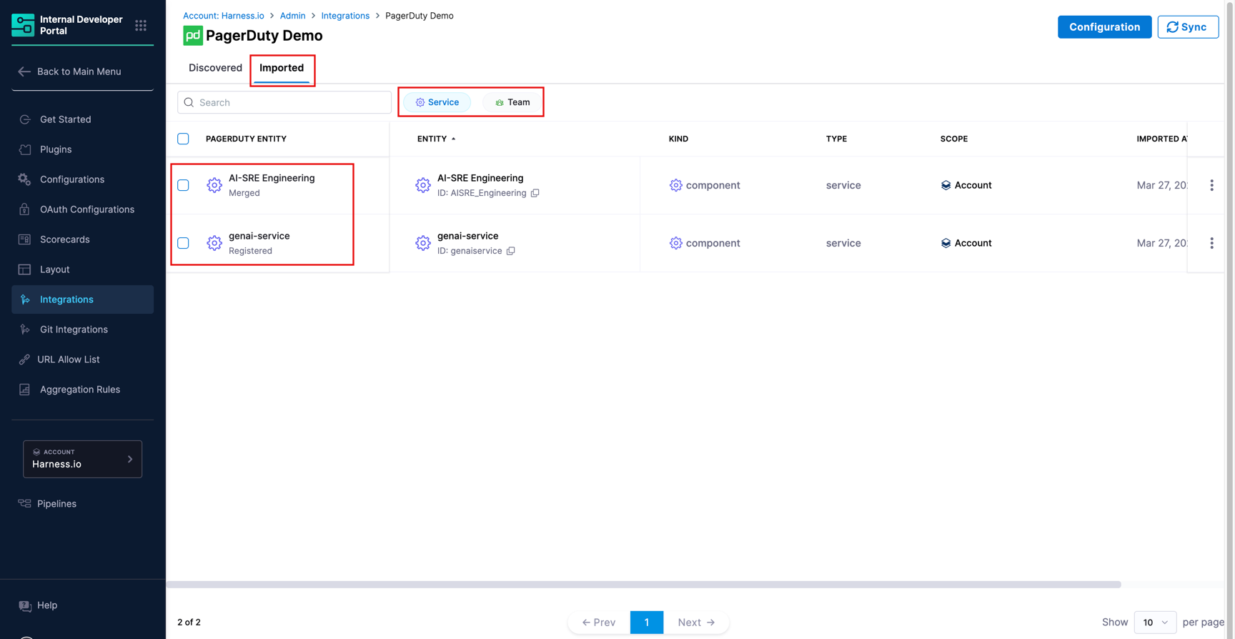 The Imported tab displays all PagerDuty entities that have been brought into the catalog. Use the Service and Team sub-tabs to view each entity type separately.