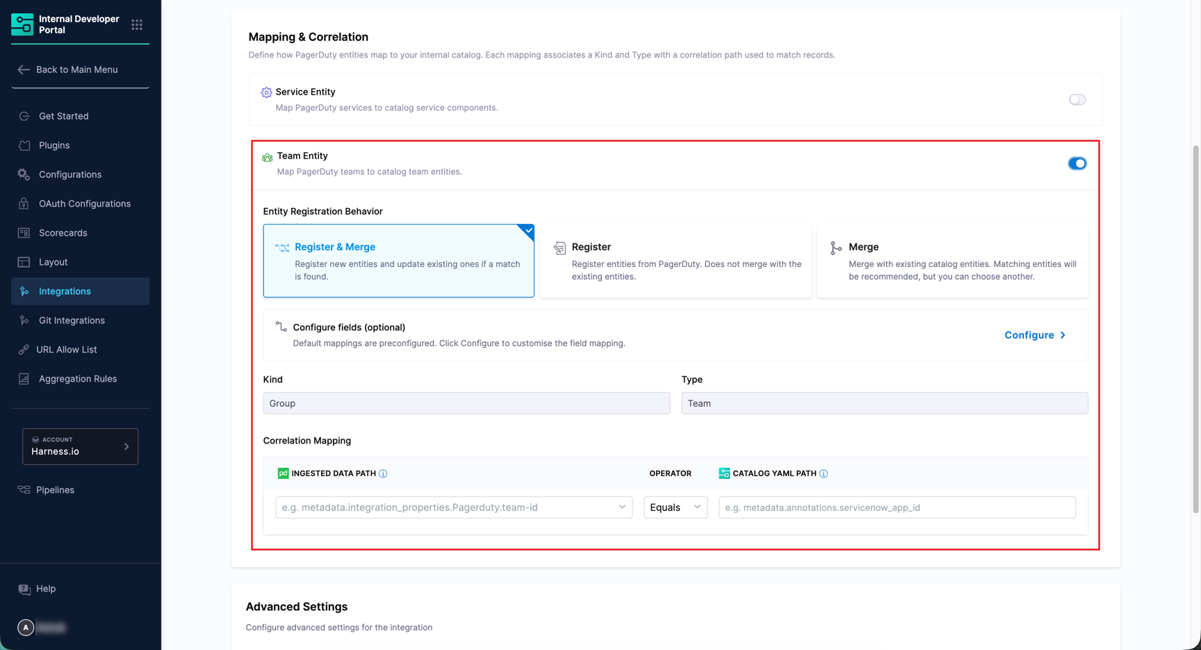 The integration supports two entity types: Service Entity and Team Entity, each with its own toggle, registration behavior, and field configuration.