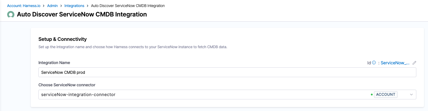 2. Select the Harness ServiceNow connector that is configured to access your ServiceNow instance. This connector is used to fetch table data from the CMDB. Please note that we support username/password and OAuth authentication for this connector.