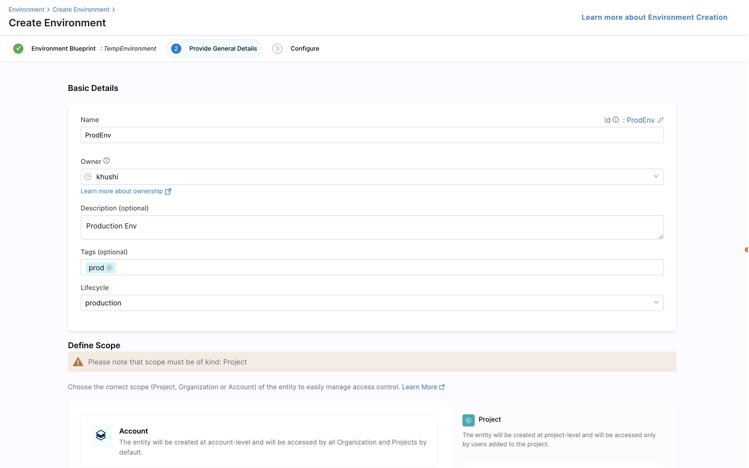 - Give your environment a Name, select owners, input lifecycle (add a new one if the dropdown list is empty), and choose your project as a scope and then Click “Configure Environment”.