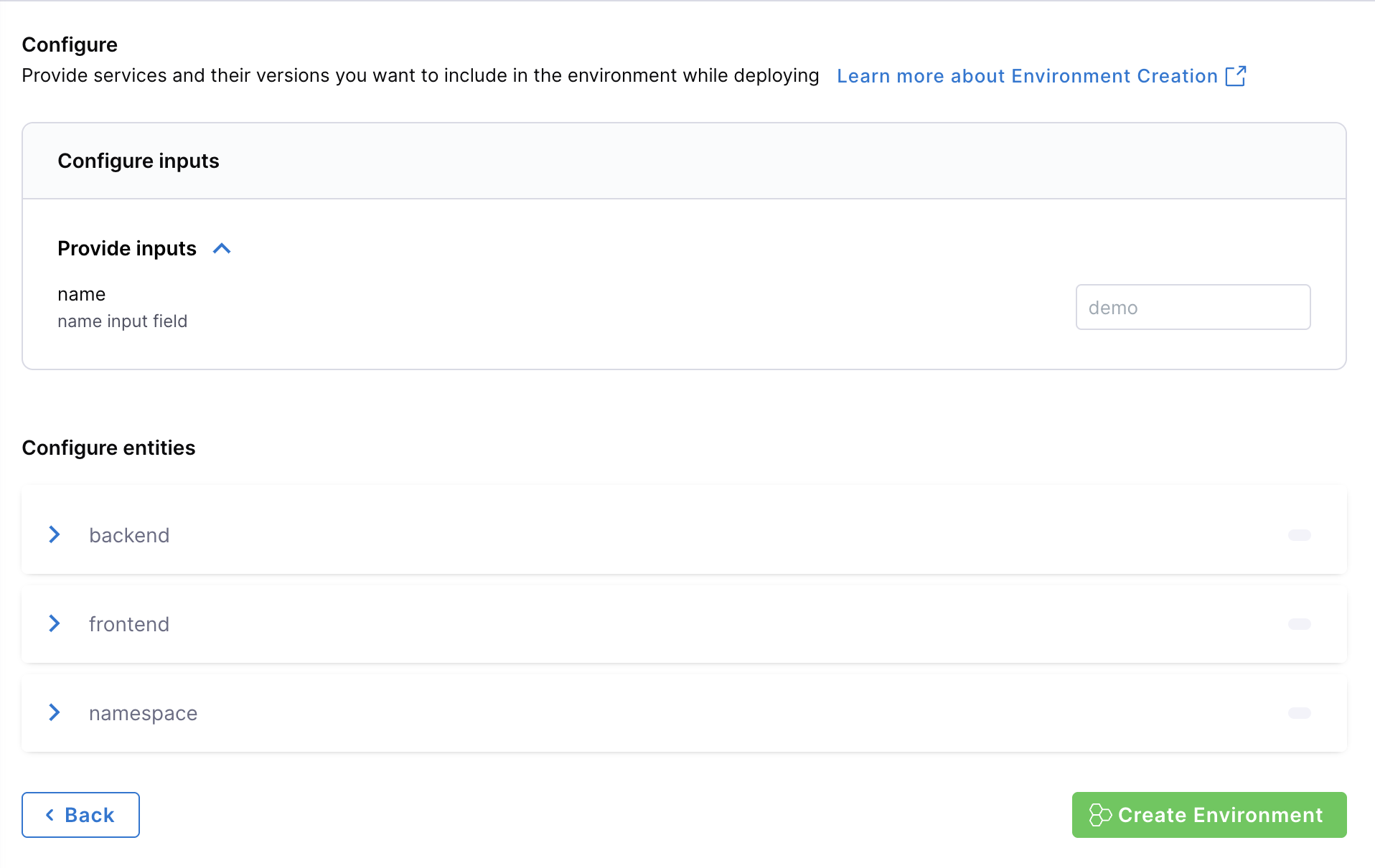 - On the new screen, you can choose and configure your inputs to the environment, and when you are satisfied, click Create Environment.