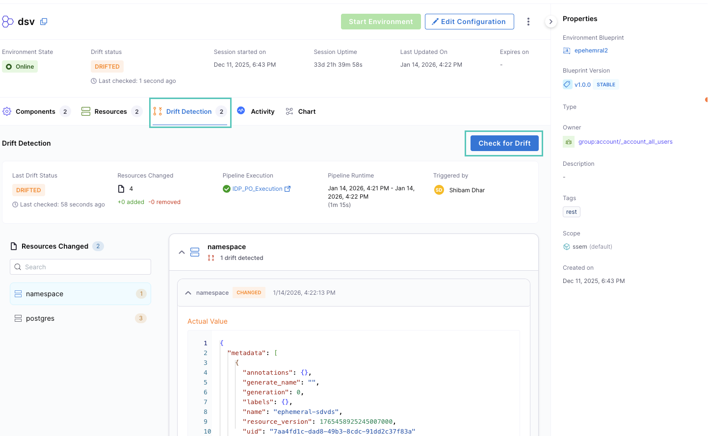 The system chains and dynamically executes drift detection pipelines for each workspace (environment resource) in your environment. Each pipeline checks its corresponding infrastructure resource against its expected state and highlights any discrepancies. You can view drift details resource-by-resource to see which attributes have changed, making it easy to understand what has drifted and take corrective action.