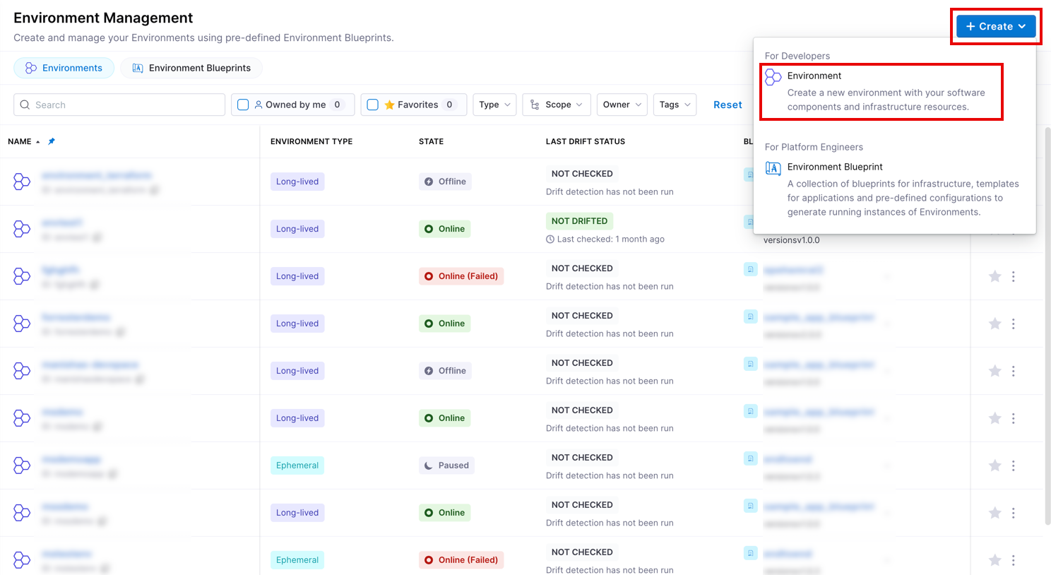 - In Harness IDP (Environments), click + Create in the right corner, then select Environment.