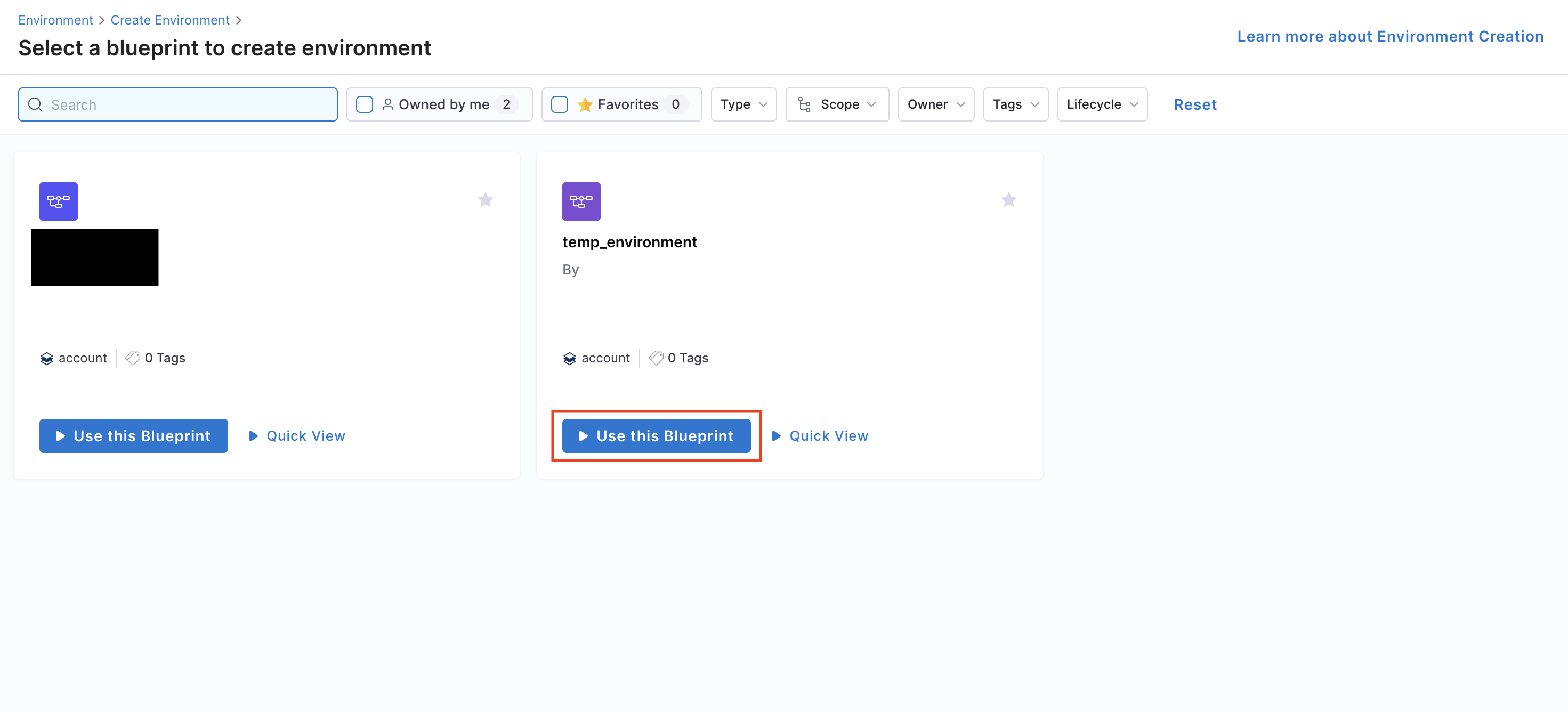 - A list of available environment blueprints will be visible. Select your new environment by clicking the Use this Blueprint option beneath it.
