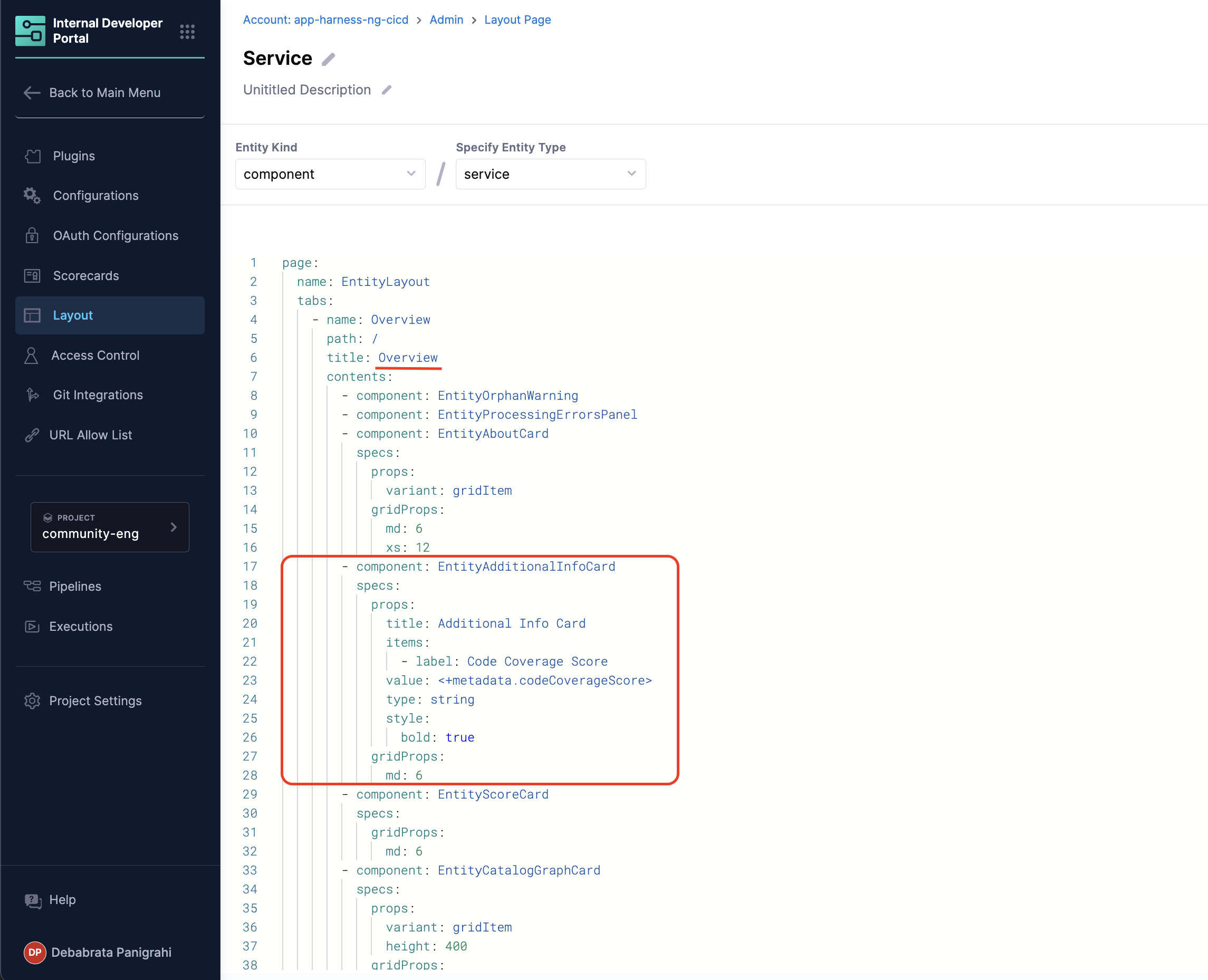 - Now Select Edit Layout for component Service and add the following under Overview card.
