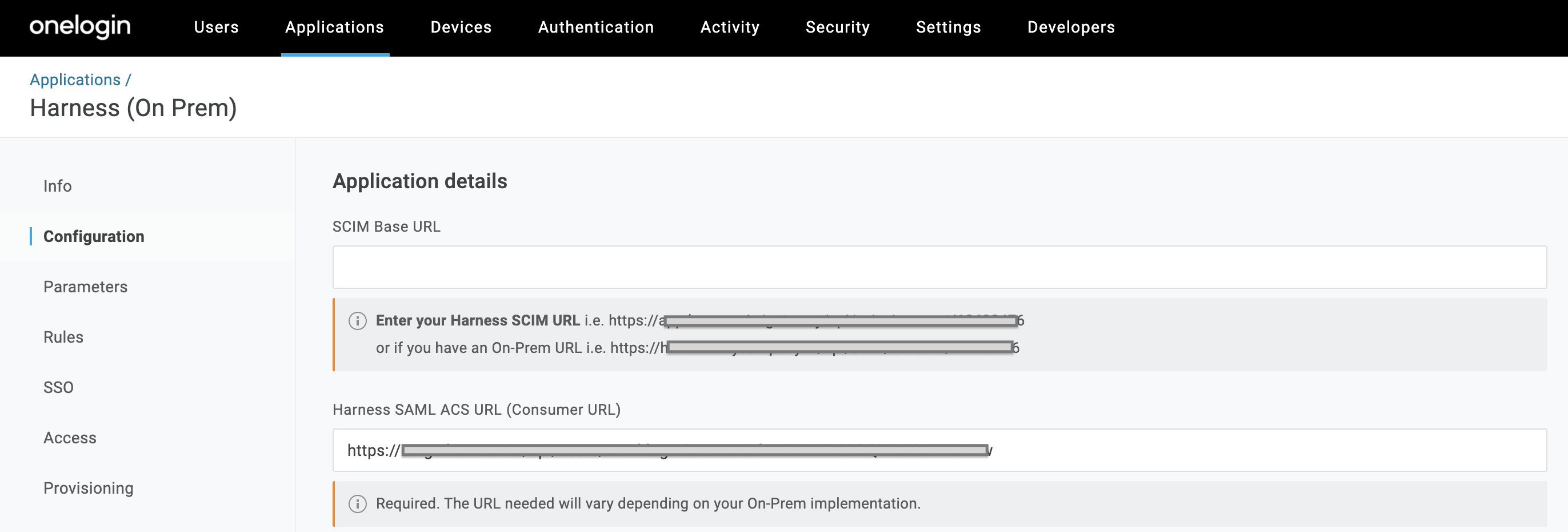 If you environment is On-Prem (SMP) the URL will use your custom domain name and omits gateway. For example, if your On-Prem domain name is harness.mycompany.com, then your SCIM base URL would become https://harness.mycompany.com/ng/api/scim/account/[YOUR_ACCOUNT_ID].