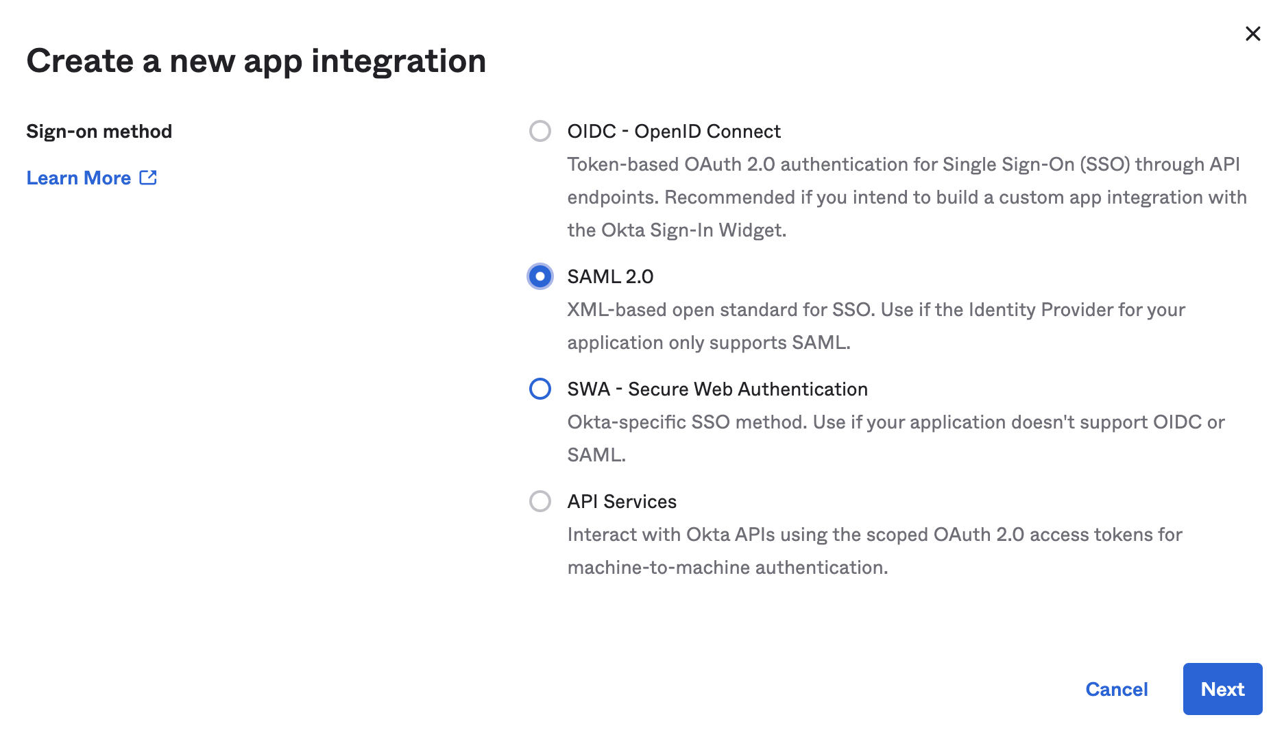 3. Select SAML 2.0, then select Next.