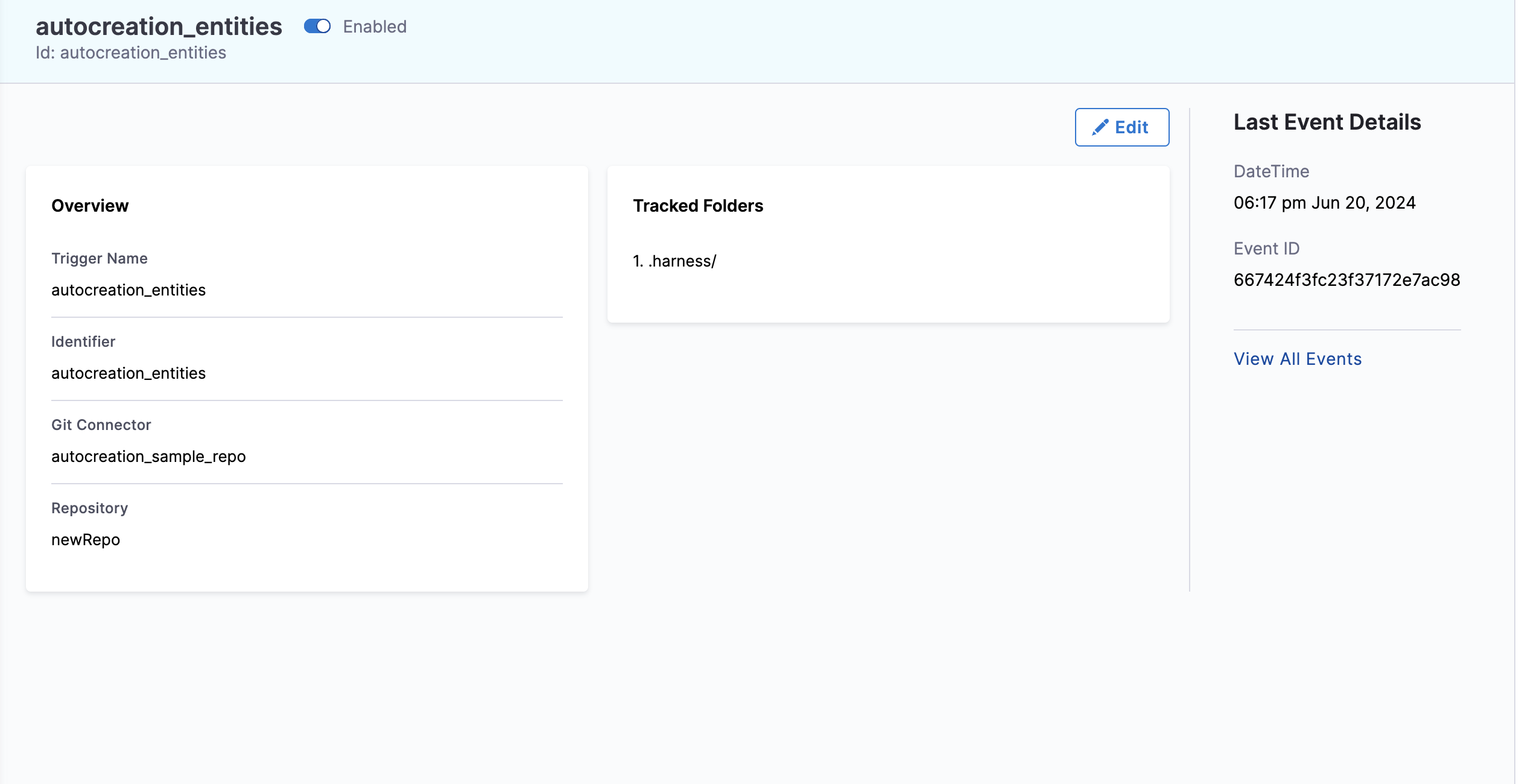 Autocreation is a feature that allows you to automatically create entities in Harness when files are added remotely within your Git Repository. The files, in this case, are created within Git, so the object is initiated and created within your repository in the correct directory.