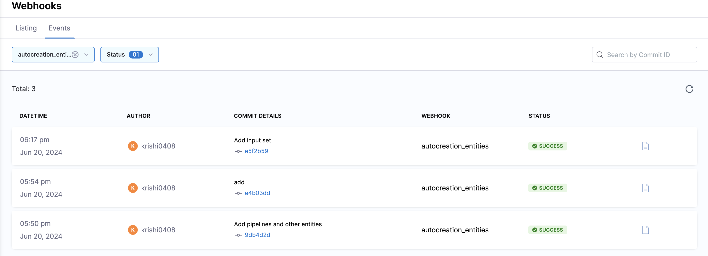 Break large commits into batches of fewer than 500 entity files to ensure all entities are created successfully. You can track the status of webhook events — including any warnings about unprocessed files — on the Webhooks > Events page in your project or account settings.