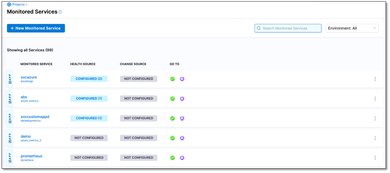 - In Harness, select Deployment > Monitored Services. A list of monitored services is displayed. The list also displays the number of health sources configured for each monitored service.