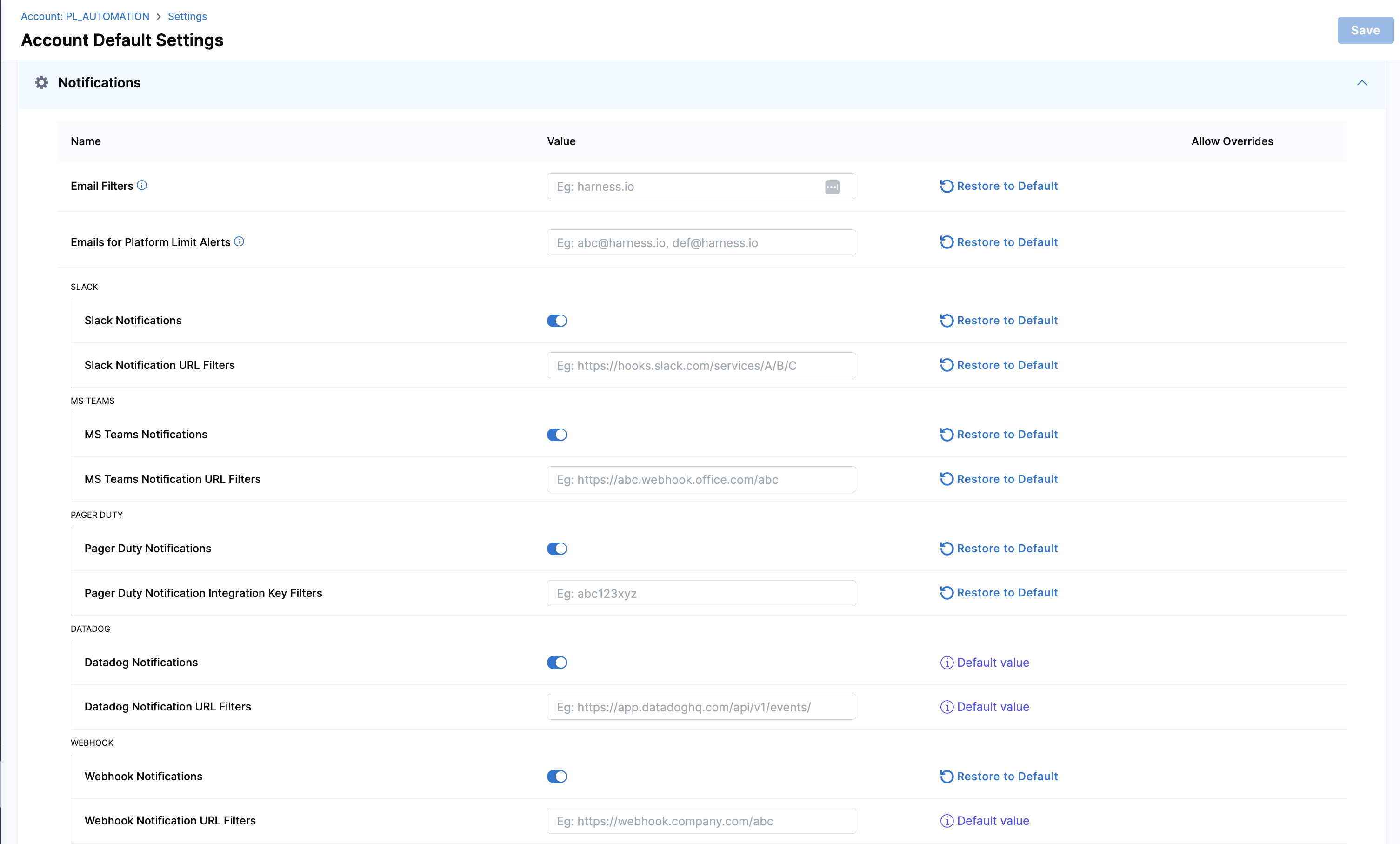 Notification settings allow you to control which notification channels are available across your Harness account. These settings are managed at the account scope and apply to all organizations and projects within the account.