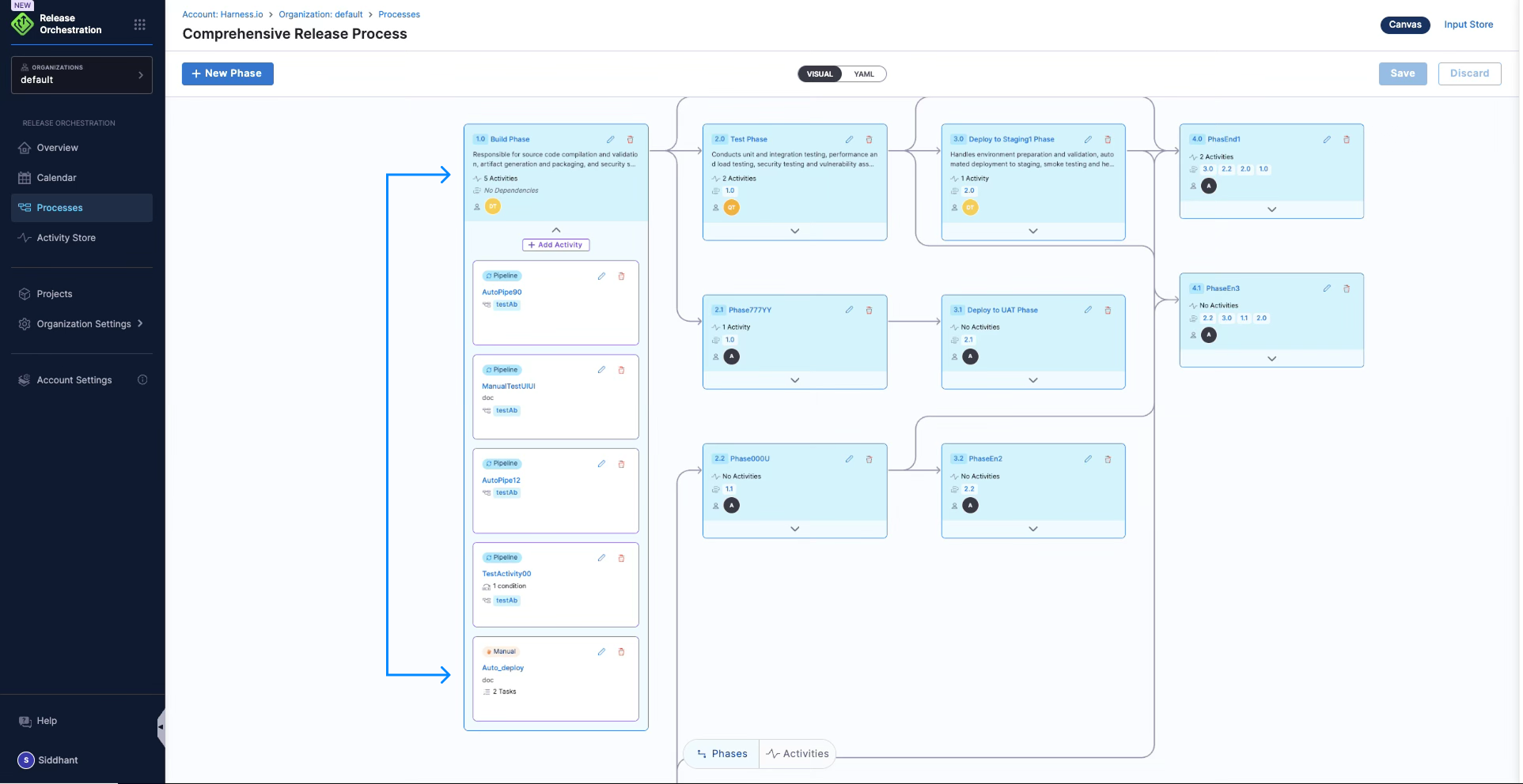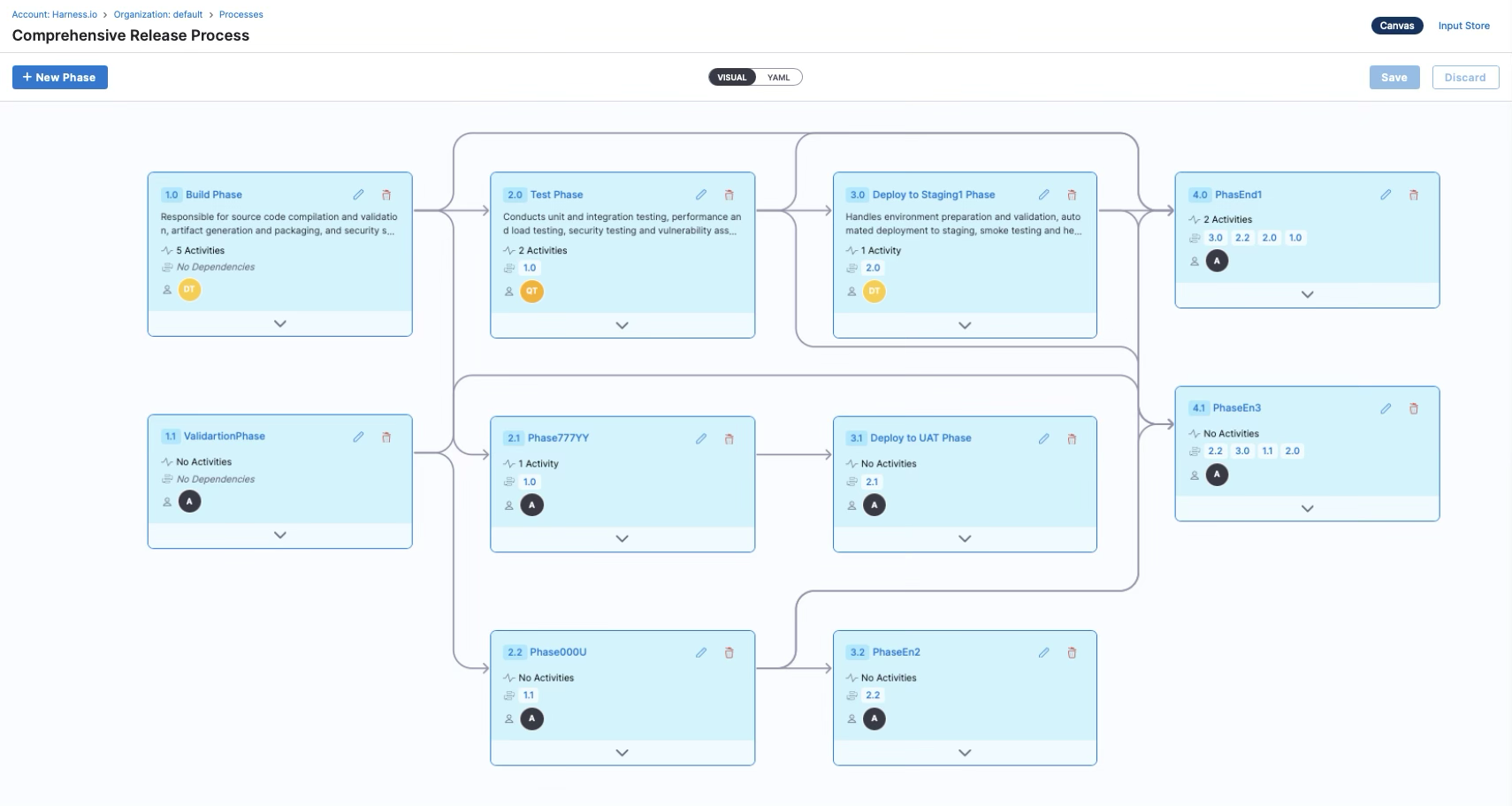 The visual canvas for a process, displaying phases (Build, Test, Deploy to Staging, UAT) laid out with dependency arrows. Each phase card shows its activity count and assigned owner.