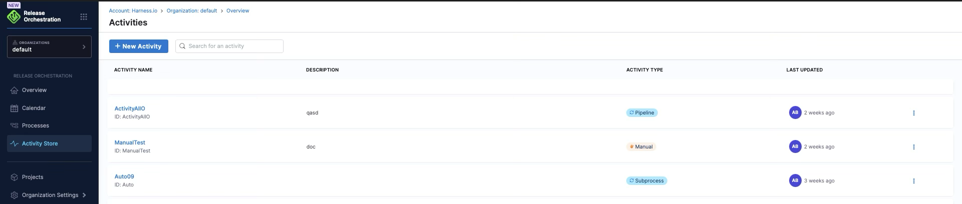 The activity store contains a collection of reusable activities with inputs and outputs encapsulating the pipelines. Harness Release Orchestration provides activity stores where all the reusable activities pertaining to different processes can be modeled and selected. Activities can be reused across different processes, promoting consistency and reducing duplication.