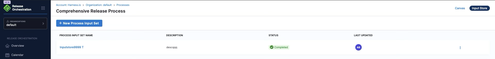 The Input Store for a process, showing a saved process input set with its name, description, completion status, and last updated timestamp.