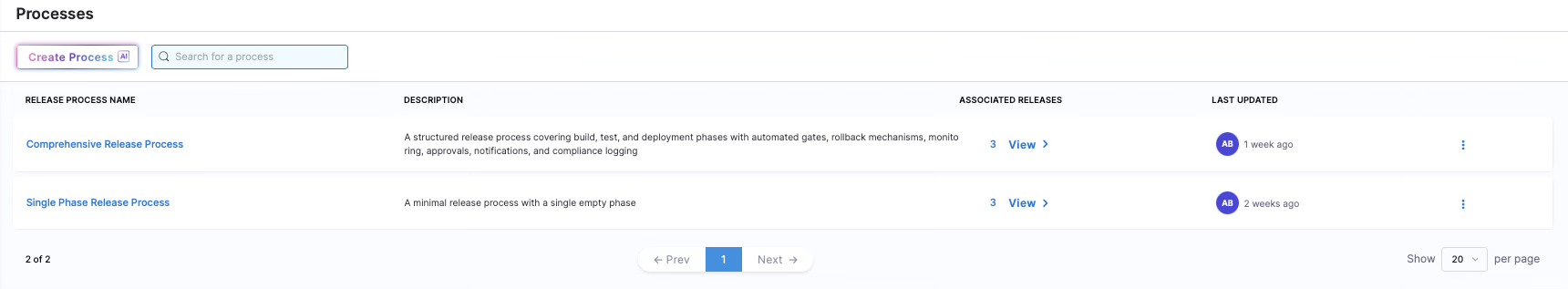 The Processes list view showing saved release processes with their descriptions, associated releases, and last updated timestamps.