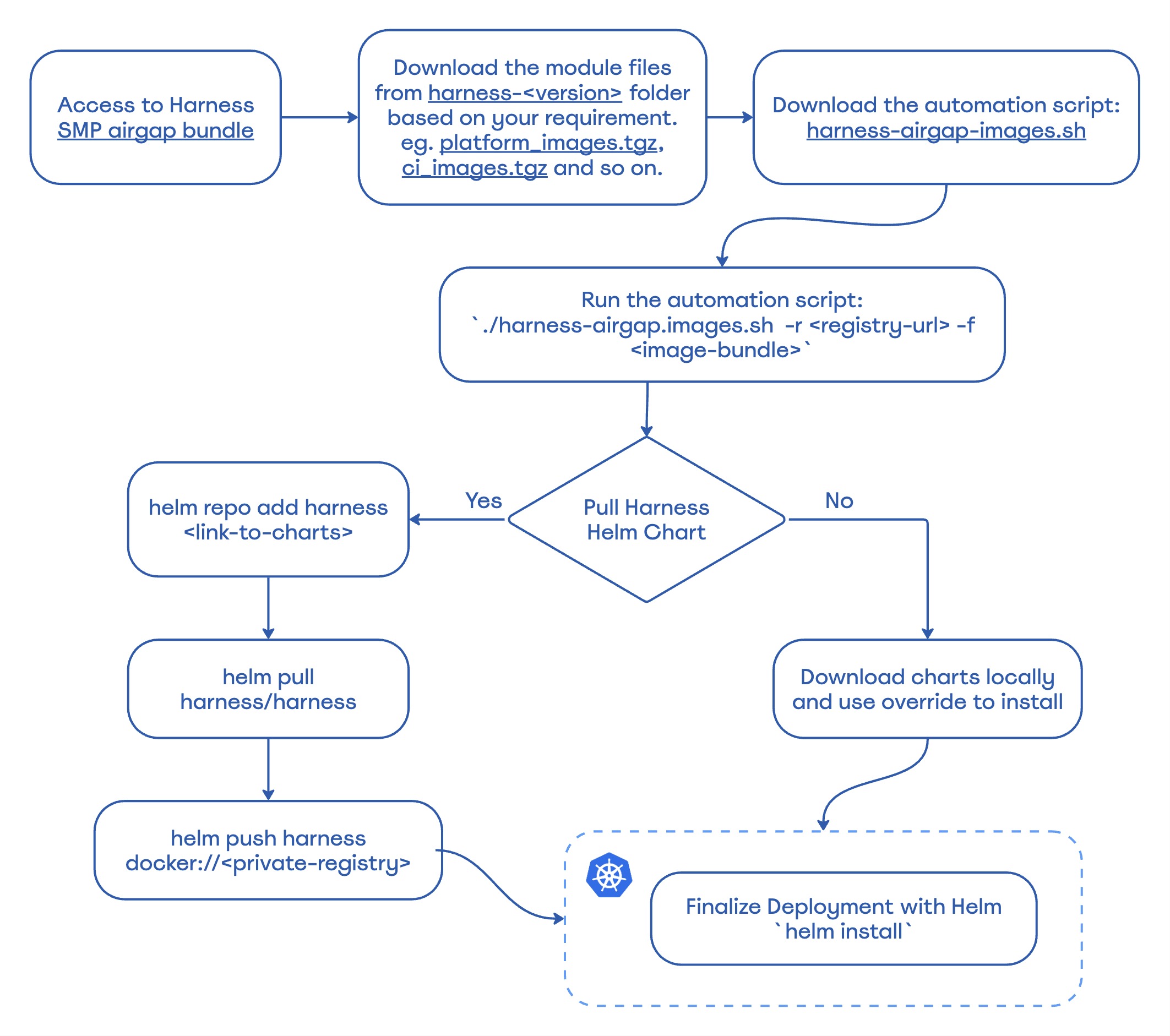 This topic explains how to use Helm to install the Harness Self-Managed Enterprise Edition in an air-gapped environment and how to obtain and transfer Docker images to a private registry with secure access. The steps include pulling Docker images, saving images as .tgz files, uploading to Google Cloud storage, downloading Helm charts, and pushing charts to your private repositories. This process ensures secure and seamless deployment of the Harness Self-Managed Enterprise Edition in restricted, offline environments.