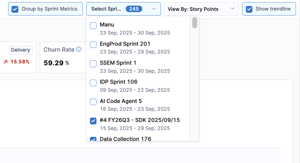 This sprint-grouped view is ideal for sprint retrospectives, trend analysis across recent sprints, and comparing sprint-level execution consistency. You can use the Select Sprints dropdown menu to filter the dashboard to one or more specific sprints.