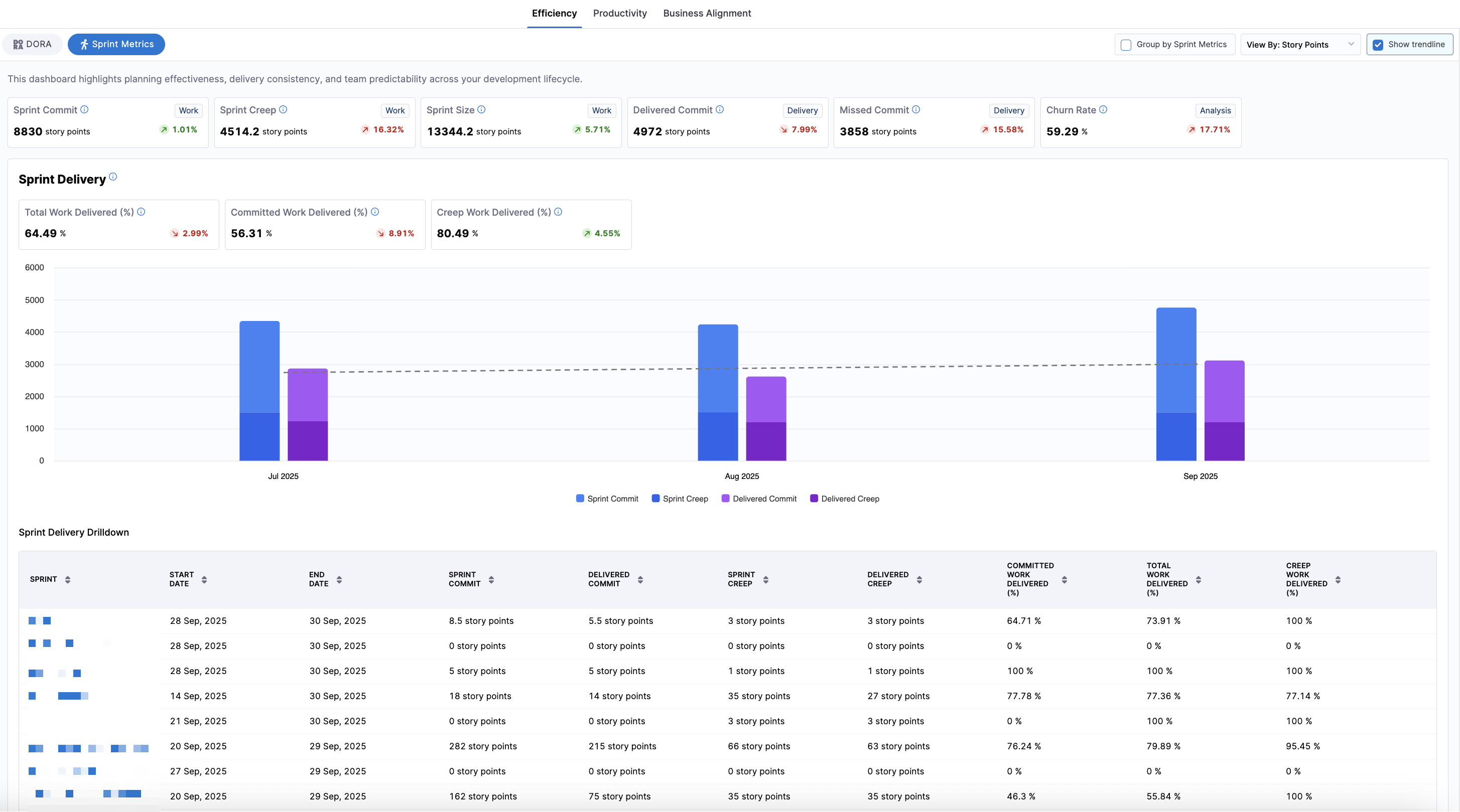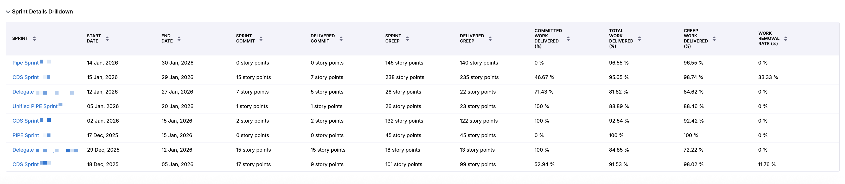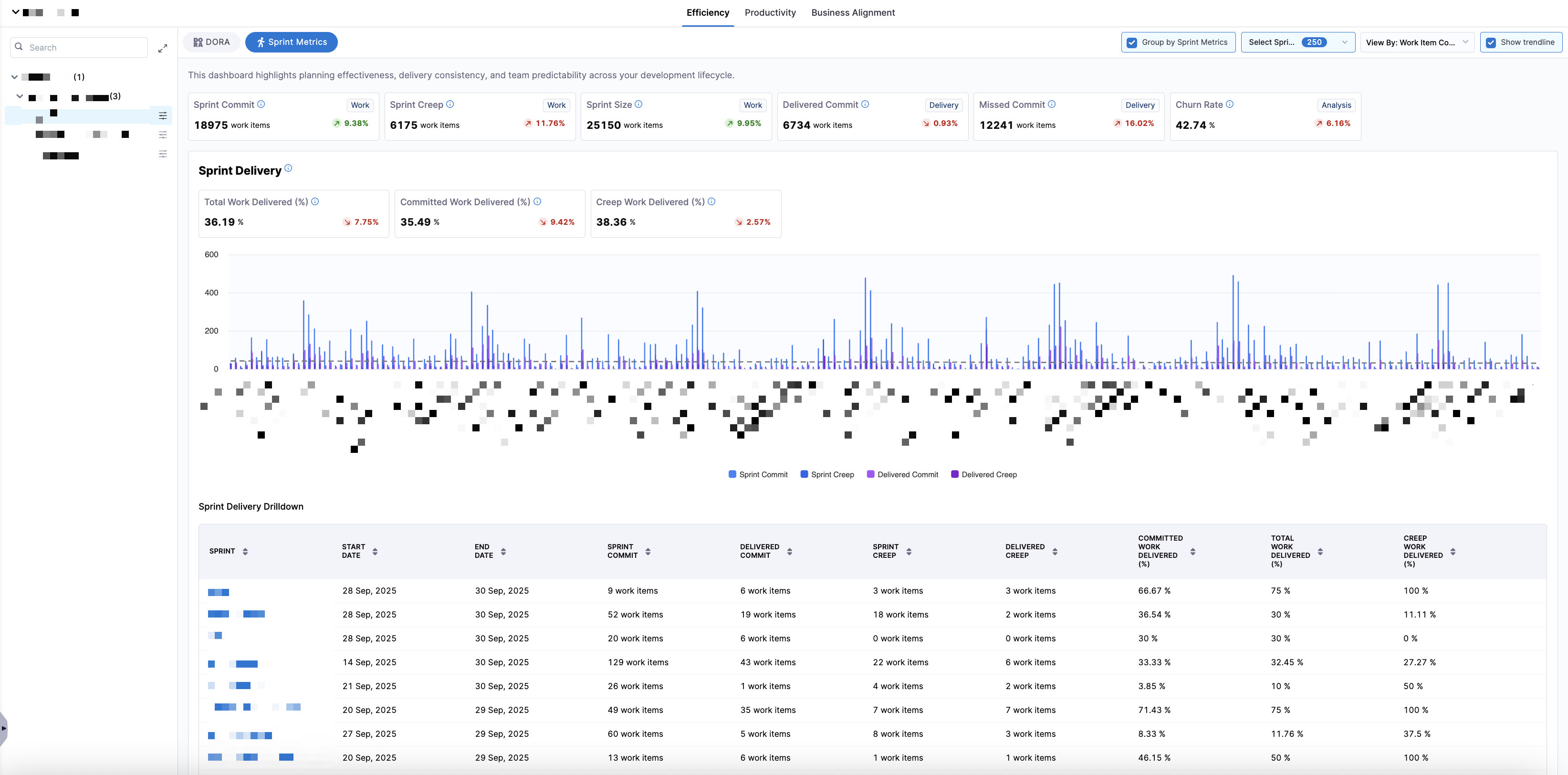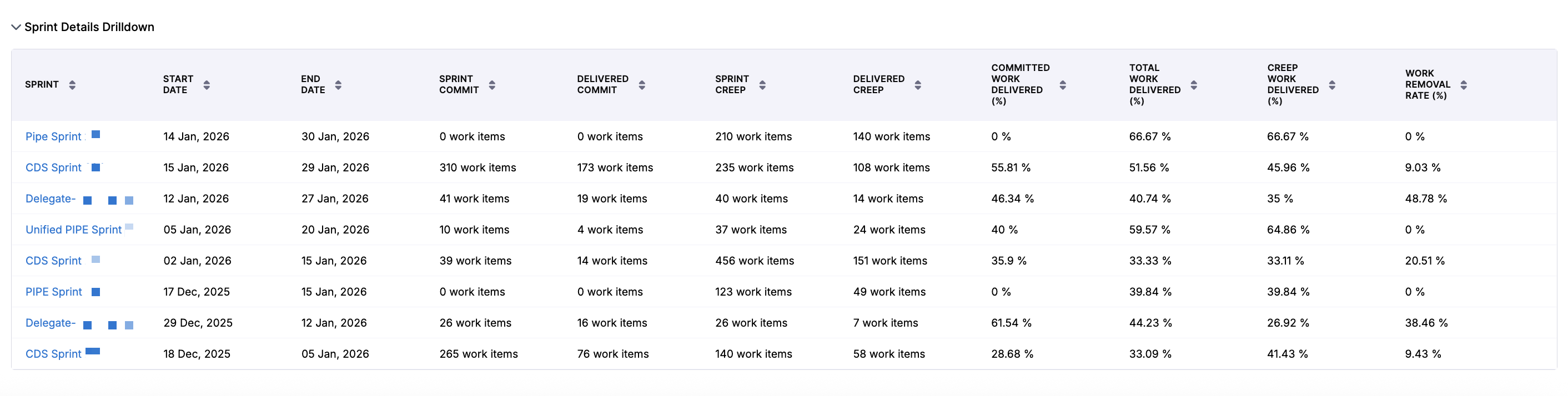 - Delivery efficiency (Total Work Delivered %, Committed Work Delivered %, Creep Work Delivered %, Work Removal Rate %)
