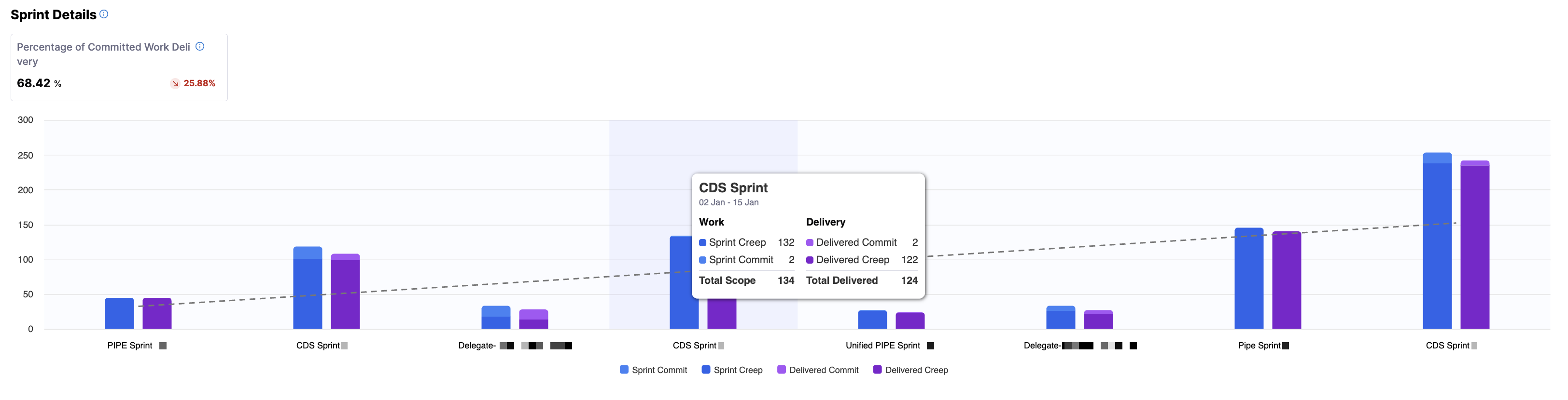 When you click into a sprint, you can access sprint-specific delivery performance and work item or story point-level drilldowns, allowing you to analyze which committed items were delivered, which creep items were added and delivered, which items were missed, and how individual work items contributed to sprint outcomes.